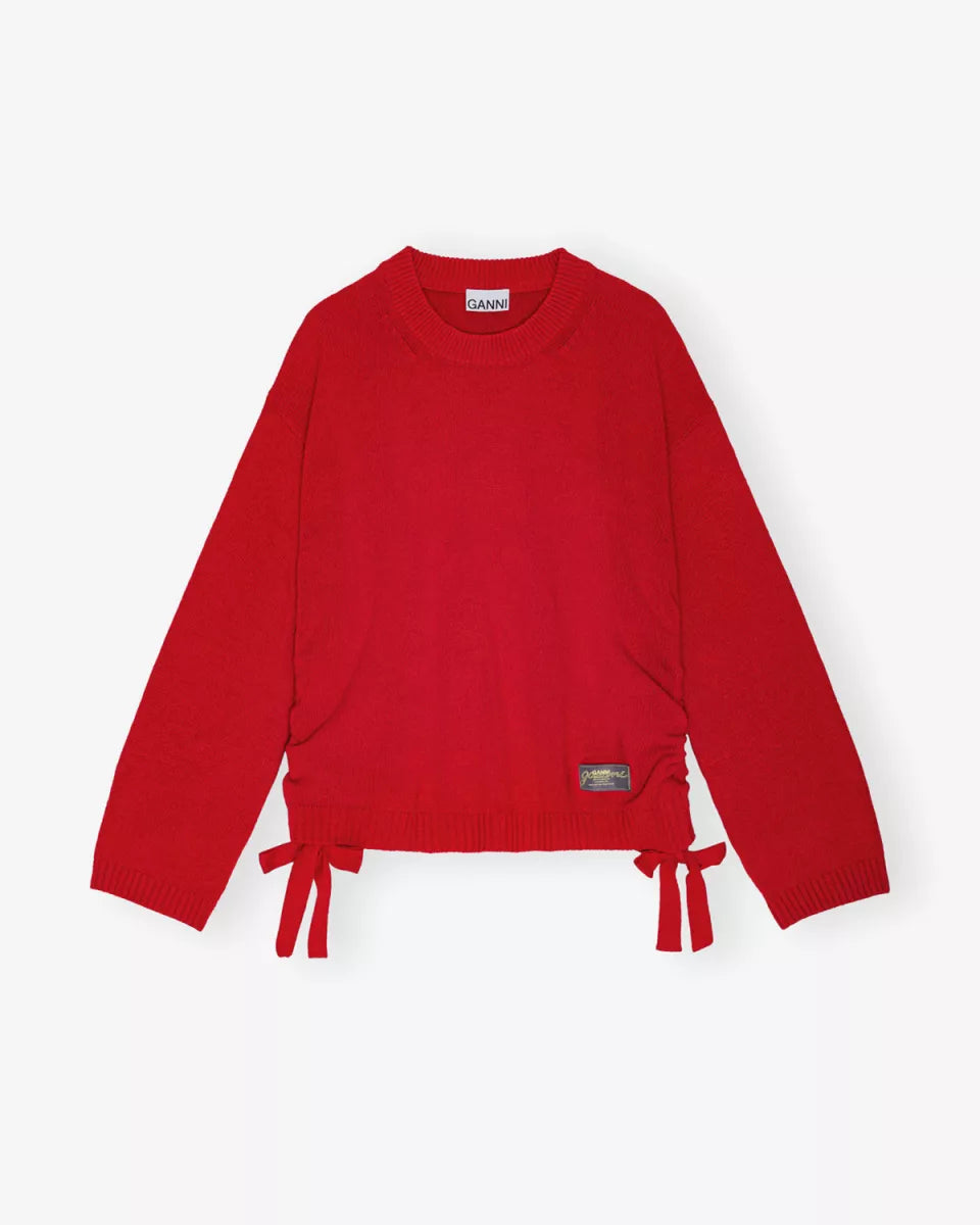 Deze grijze sweater van Ganni is een echte eyecatcher. Hij heeft een ronde hals, lange losse mouwen en geribde manchetten. Op de voorkant zit een opgenaaide GANNI-logopatch, maar het leukste detail? De ruches met strikjes die op de zijkanten zitten! Hierdoor kun je de trui op verschillende manieren stylen. (Ook verkrijgbaar in grijs melange en donker grijs).