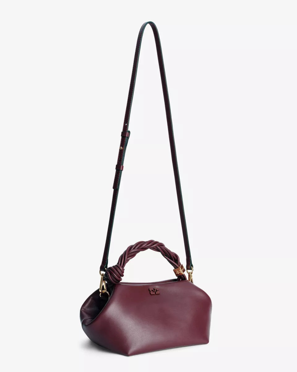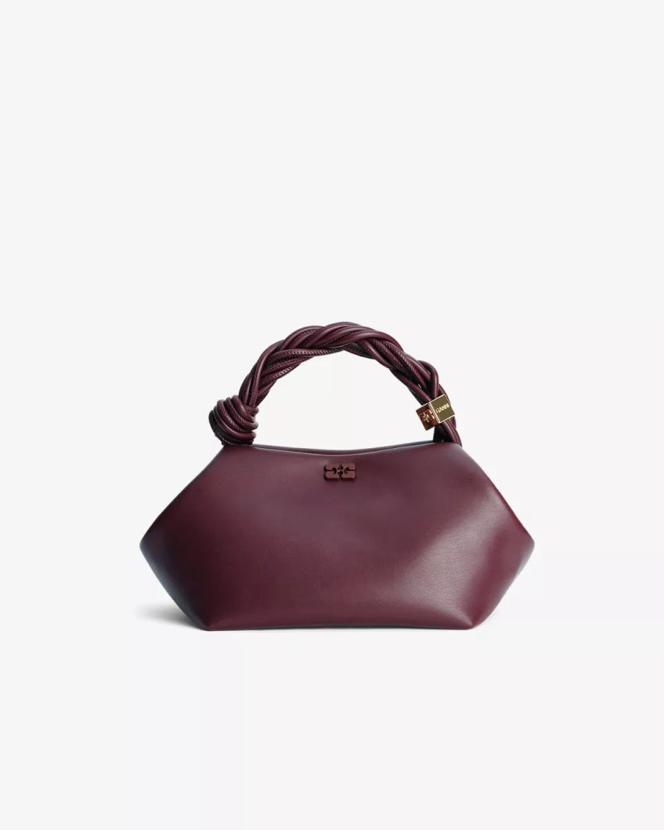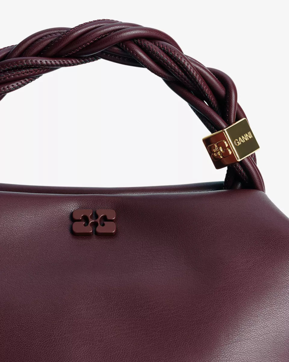 Bou Bag Small van Ganni in bordeaux, uitgevoerd in een gerecycled leerblend die stevig aanvoelt en vormvast blijft. De tas heeft een hoekige, hexagonale belijning met een gevlochten handvat en een knoopdetail. Op de voorzijde staat een subtiel GANNI logo. Afgewerkt met goudkleurig hardware en een klein dobbelsteentje met GANNI gravering. Dit is een compacte handtas met een duidelijke, grafische vorm.