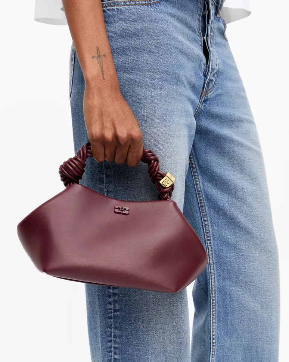 Draag deze bordeaux handtas als kleuraccent bij neutrale tinten zoals zwart, crème of grijs, of laat hem aansluiten op ton sur ton roodtinten. Combineer met minimalistische sieraden zodat de vorm en het gevlochten handvat de aandacht houden. Bekijk meer van Ganni tassen en accessoires voor een set die bij elkaar past.Productkenmerken