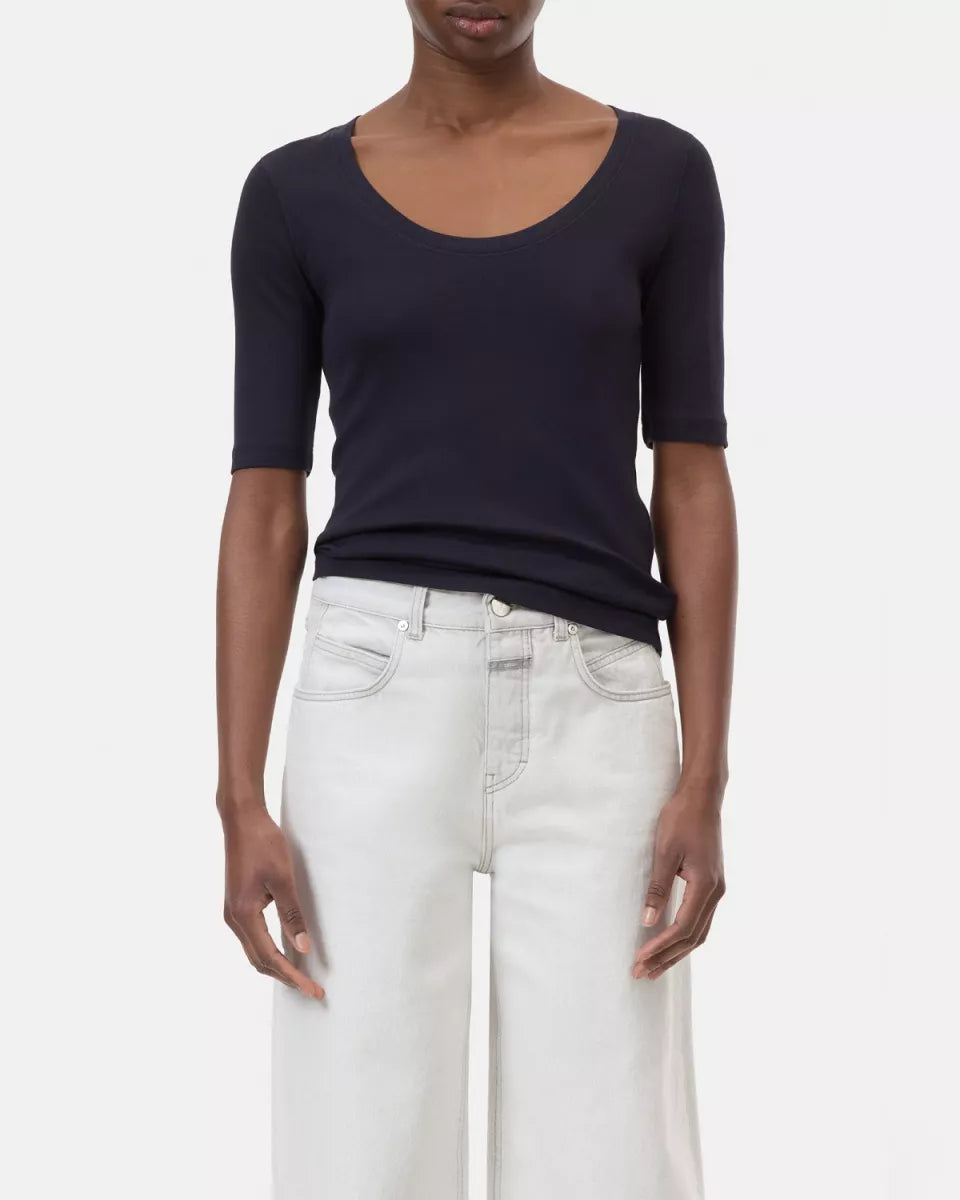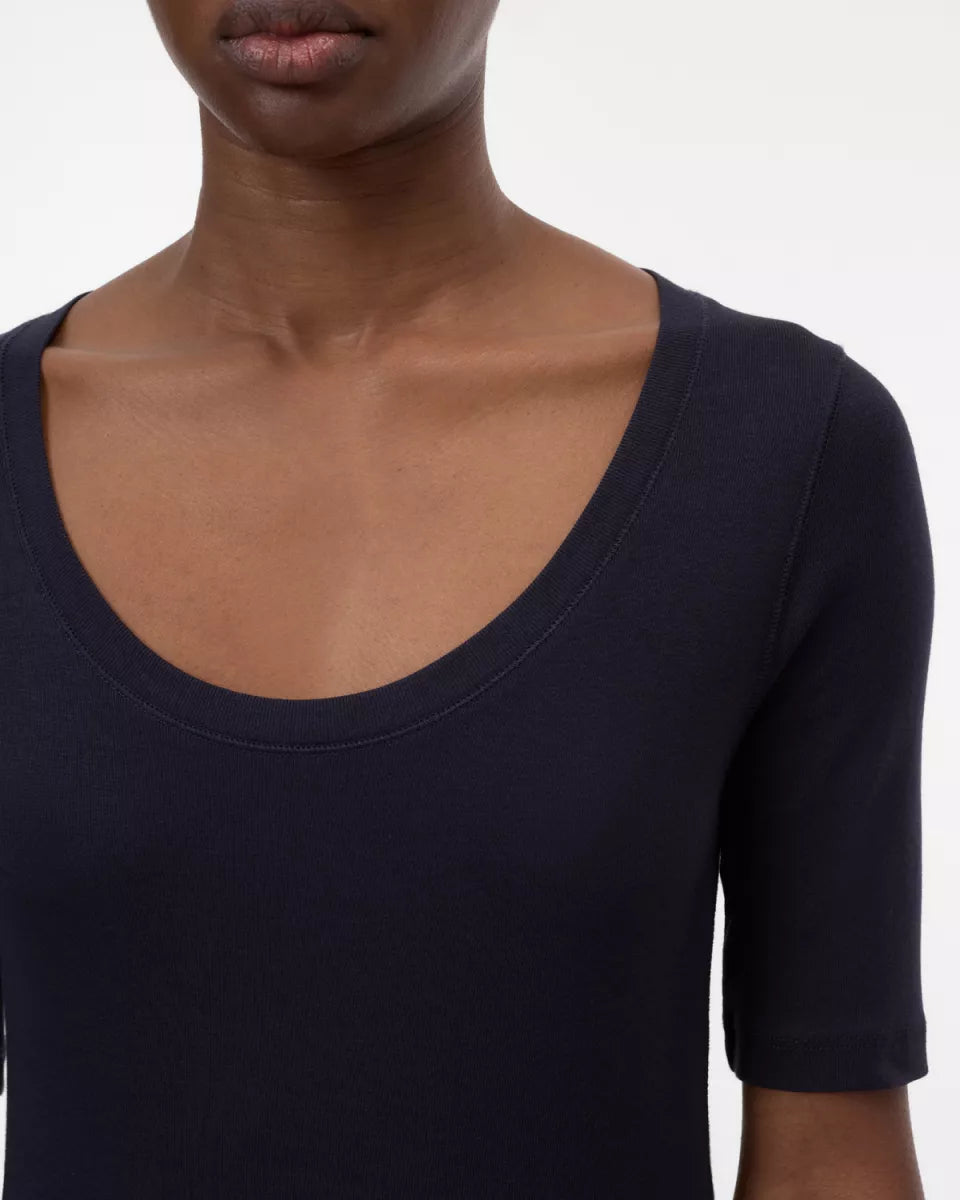 Zo’n top die je élke dag wil dragen! Dit T-shirt is gemaakt van een superzachte katoen-modal mix in fijne rib jersey. Met een ronde hals, rechtvallende zoom en 3/4-mouwen. Comfortabel, simpel en toch heel chic.