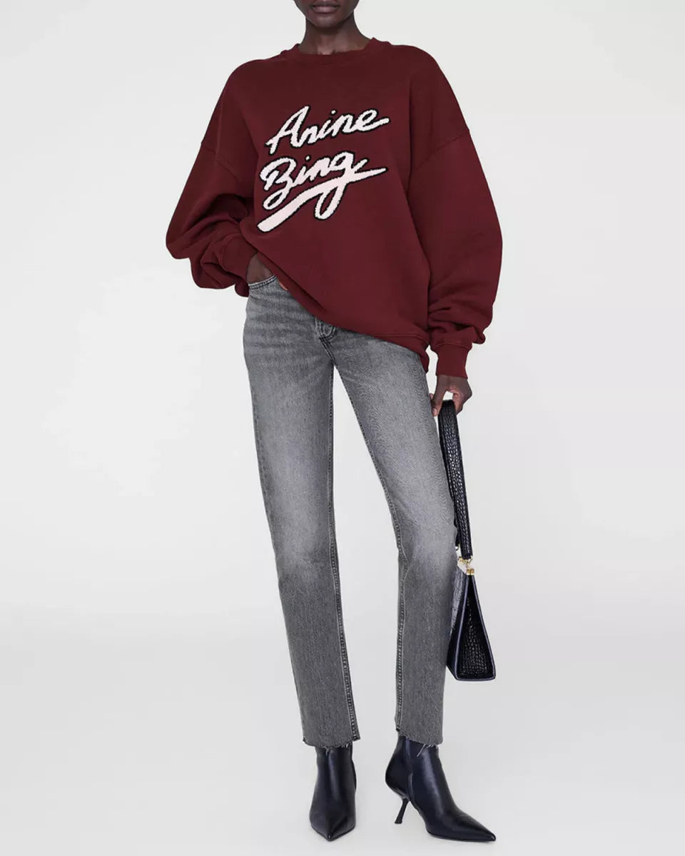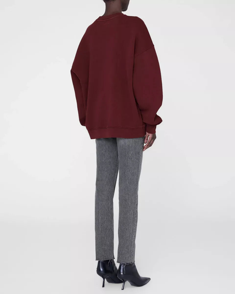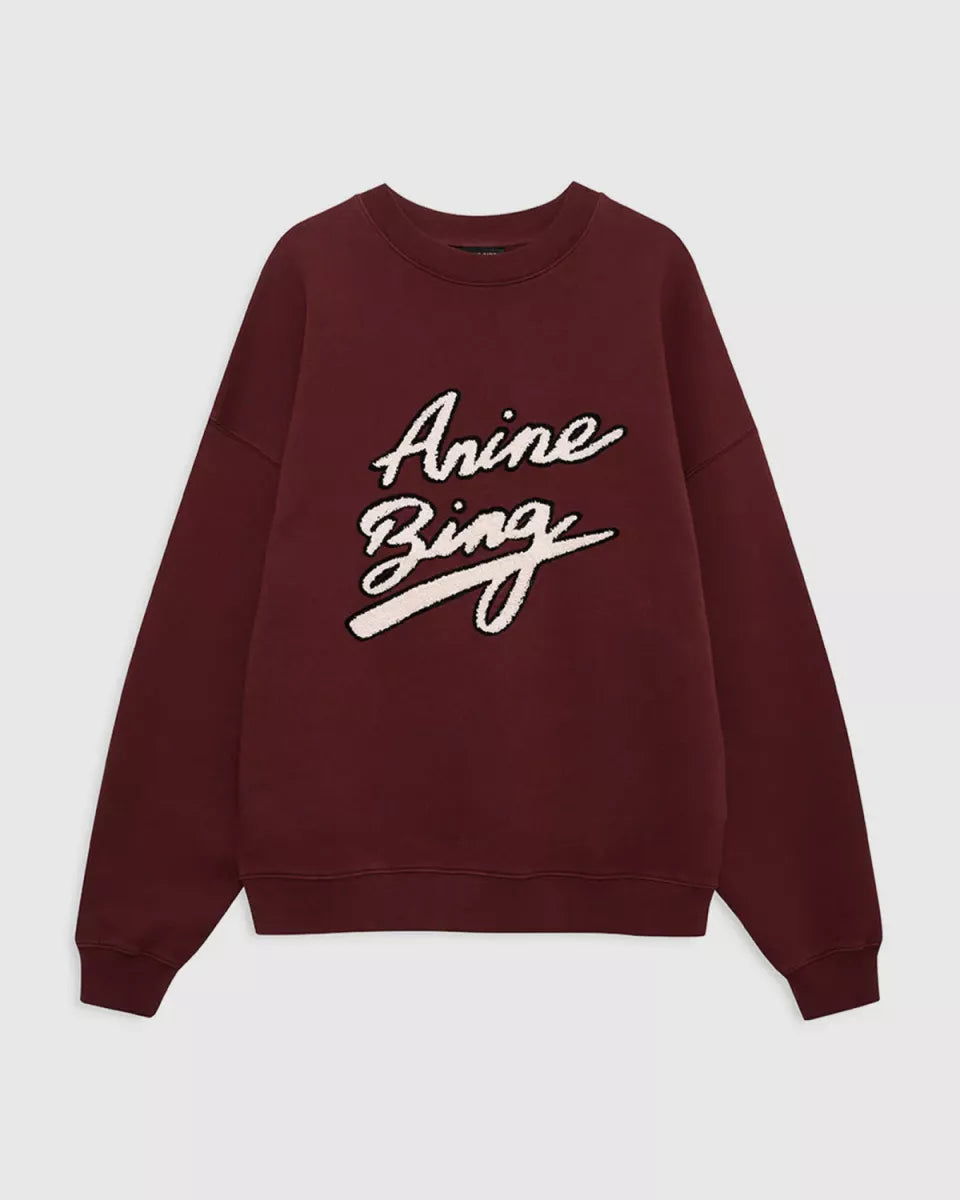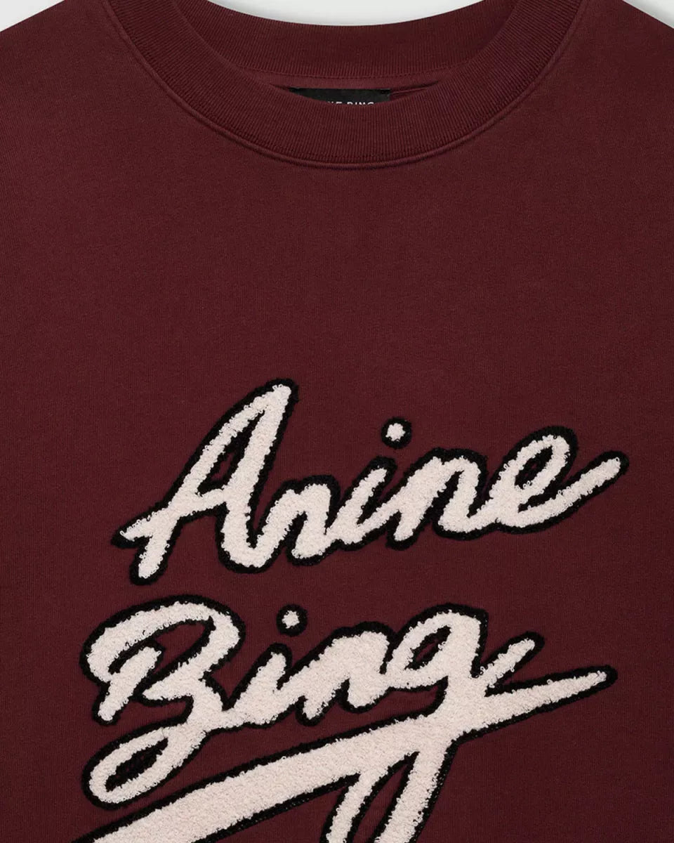 Oversized crewneck van zachte midweight cotton fleece in cabernet, lekker zacht aan de binnenkant. Met relaxte pasvorm en een chenille patch op de borst. Comfortabel en makkelijk te dragen.