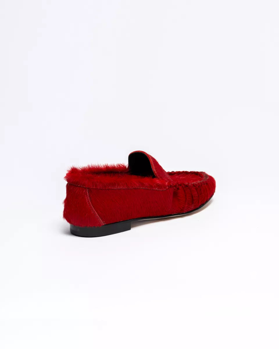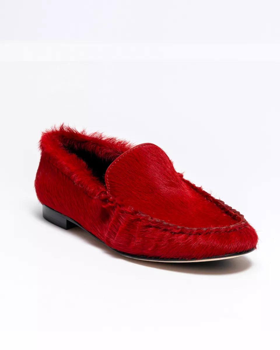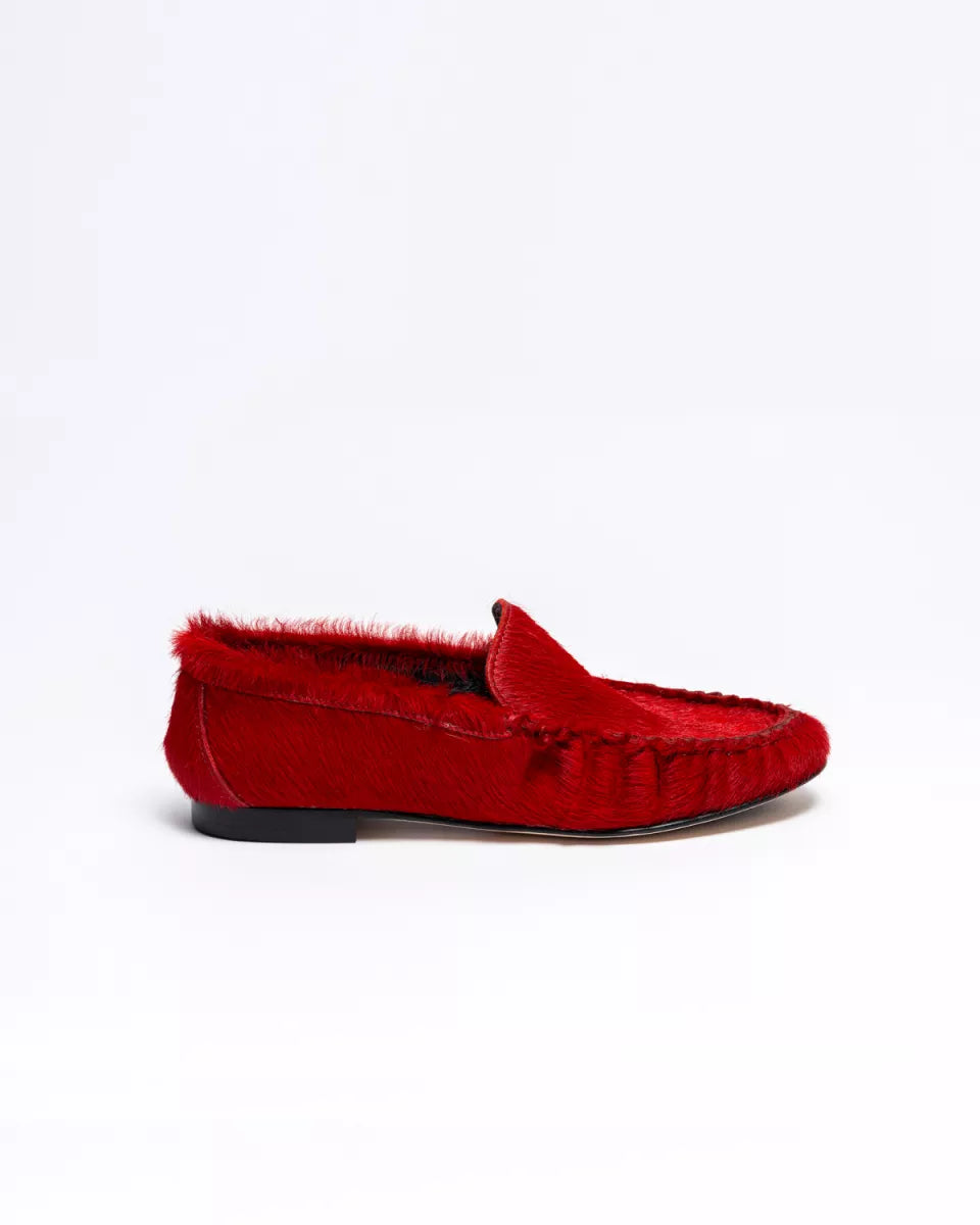 Deze opvallende rode loafer is gemaakt van luxueus cavallino-leer met een glanzende haartjesstructuur die meteen opvalt. Het vurige rood en de speelse textuur geven een klassieke loafer een moderne twist. Perfect onder een jeans of bij een pantalon of jurk (ook verkrijgbaar in glimmend leer).