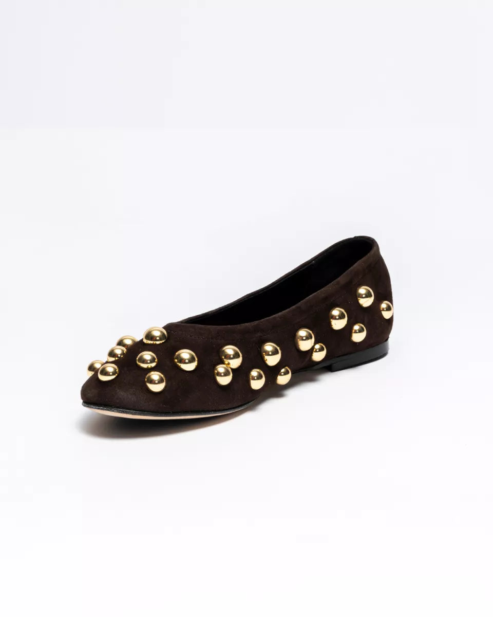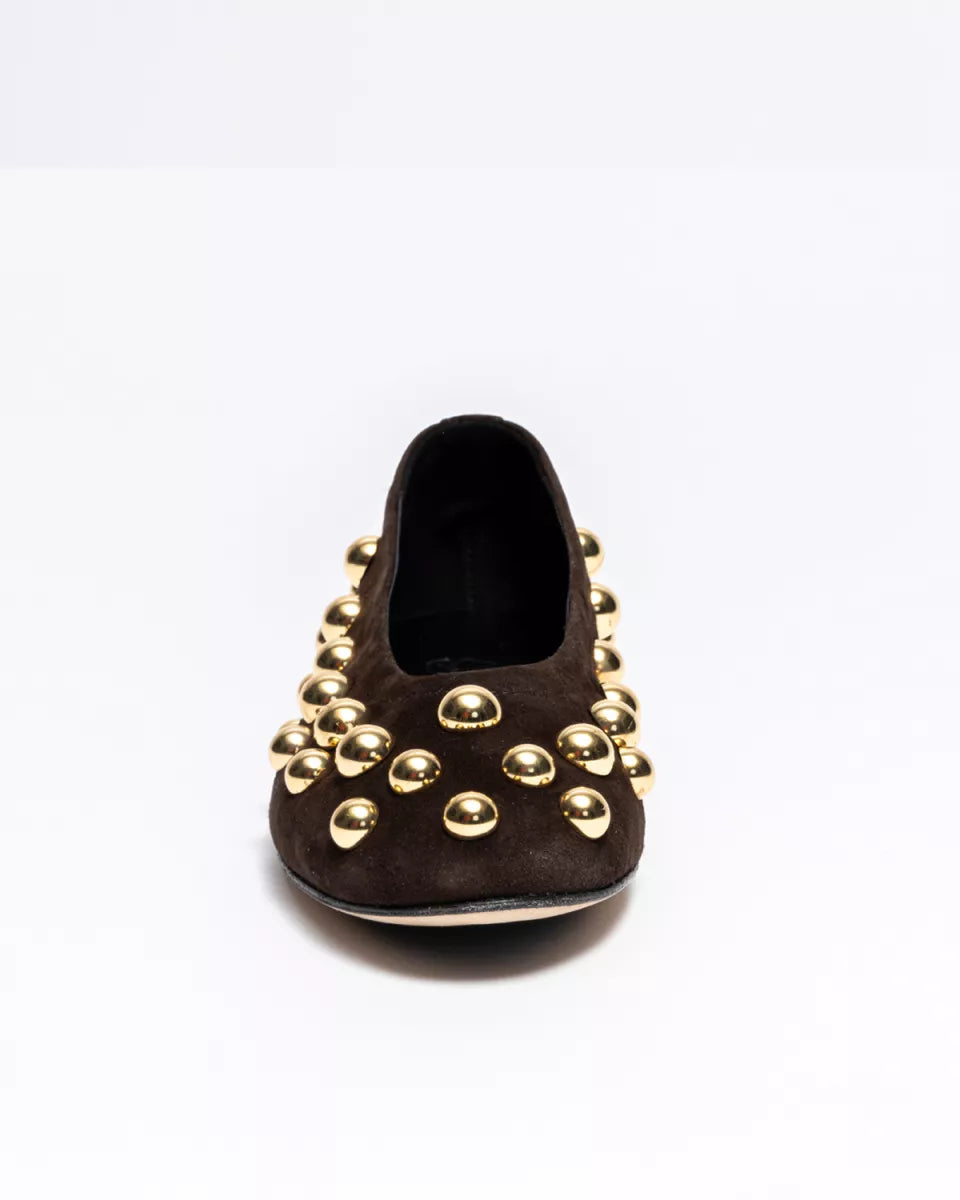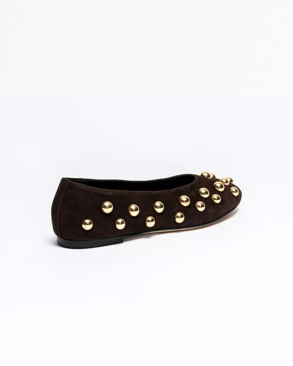 De Panna Ballerina van ODARE combineert zacht donkerbruin suède met stoere gouden studs. De ronde neus en het soepele materiaal zorgen voor comfort, terwijl de studs de schoen een krachtige, eigen uitstraling geven. Perfect bij een jeans, simpele jurk of pantalon
