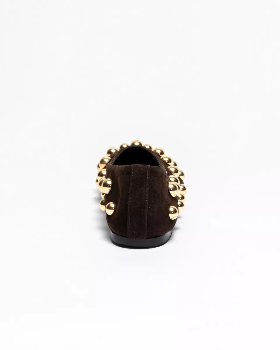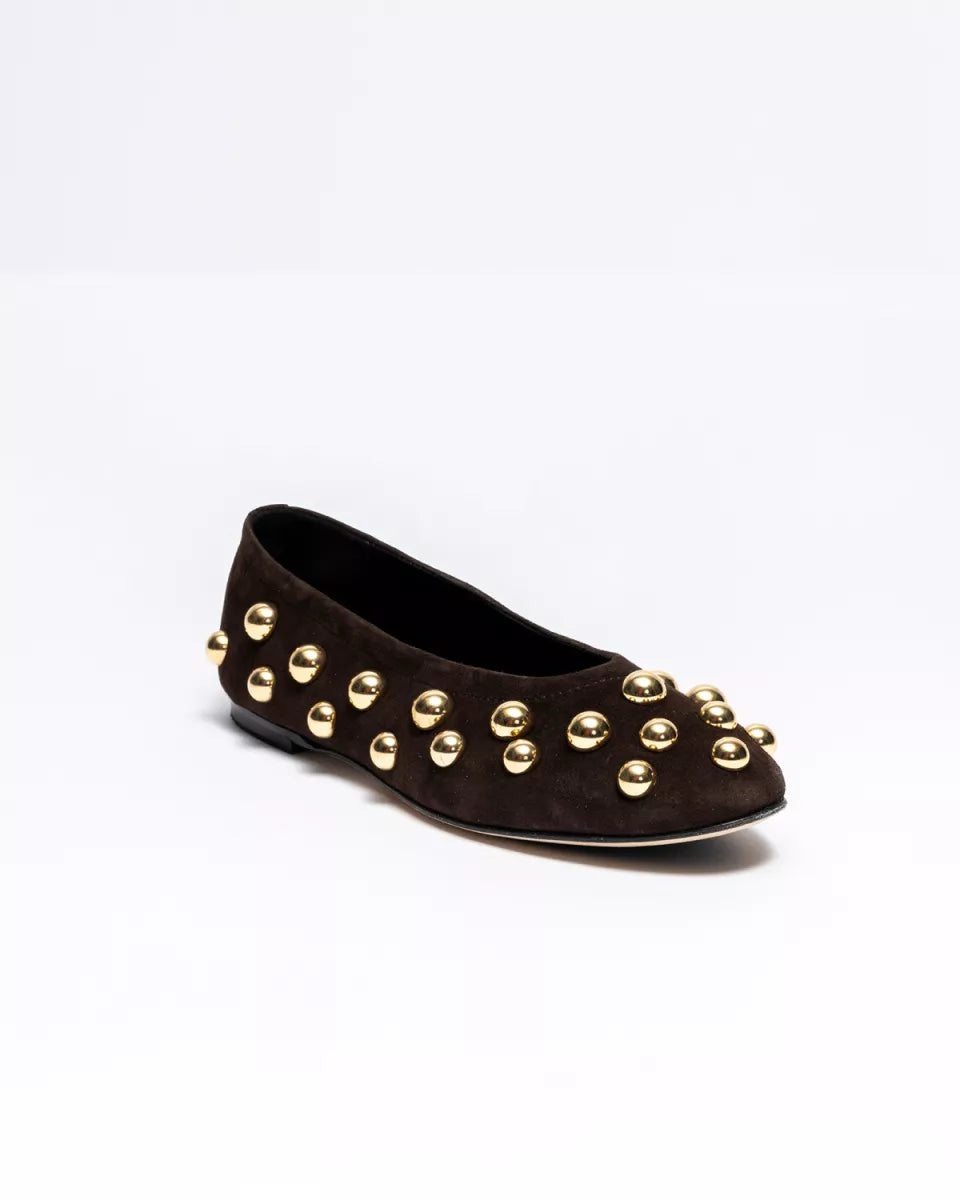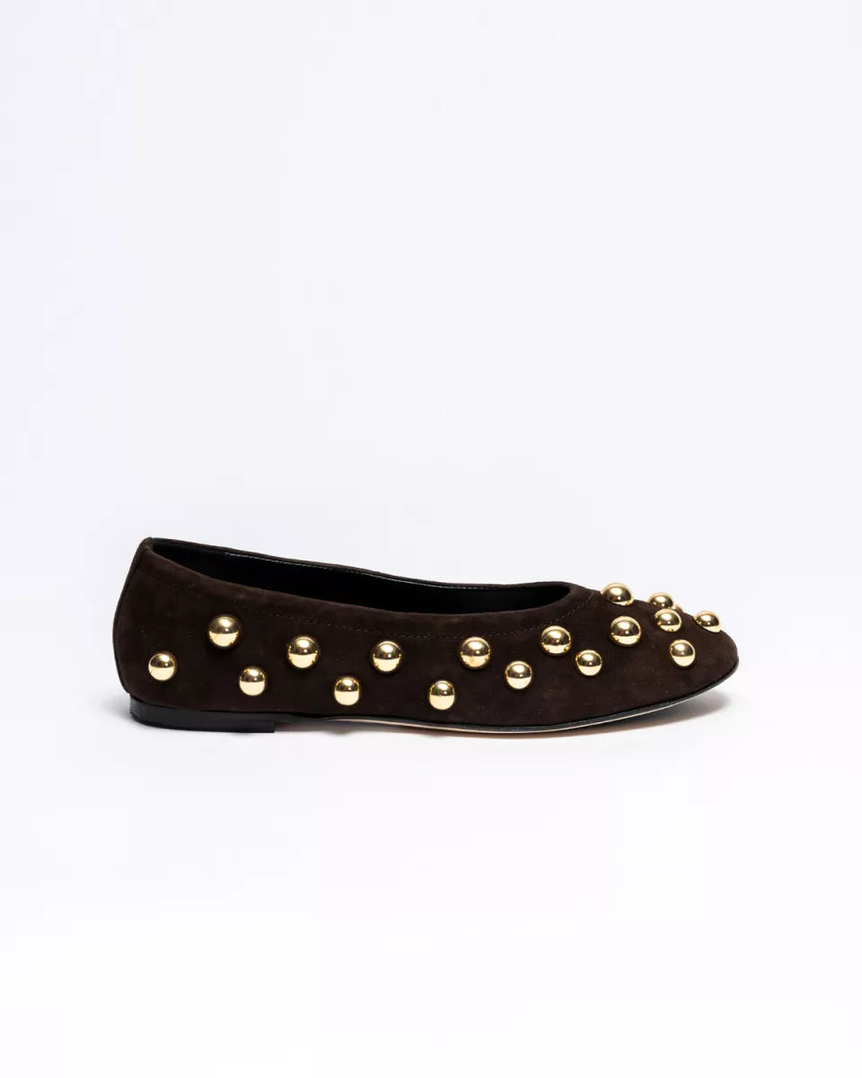 De Panna Ballerina van ODARE combineert zacht donkerbruin suède met stoere gouden studs. De ronde neus en het soepele materiaal zorgen voor comfort, terwijl de studs de schoen een krachtige, eigen uitstraling geven. Perfect bij een jeans, simpele jurk of pantalon
