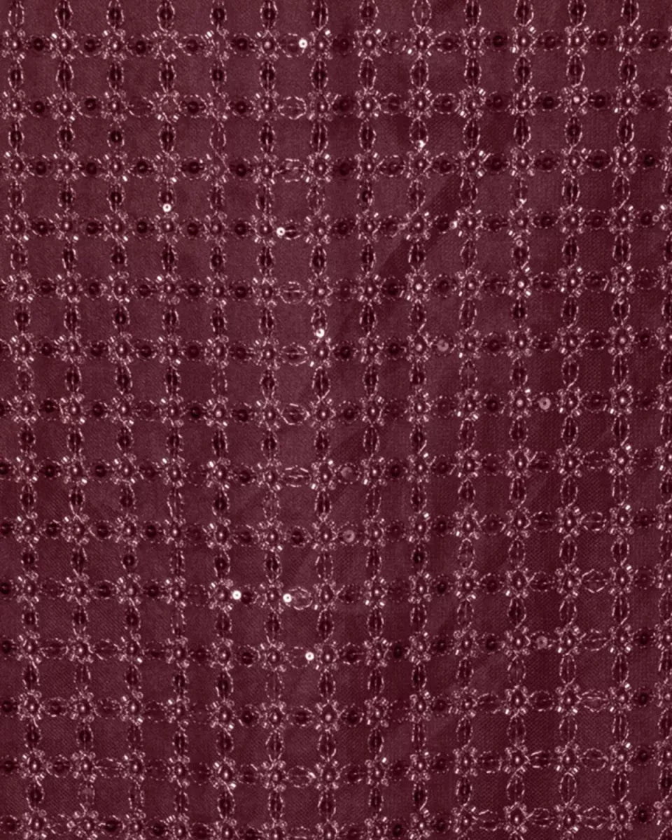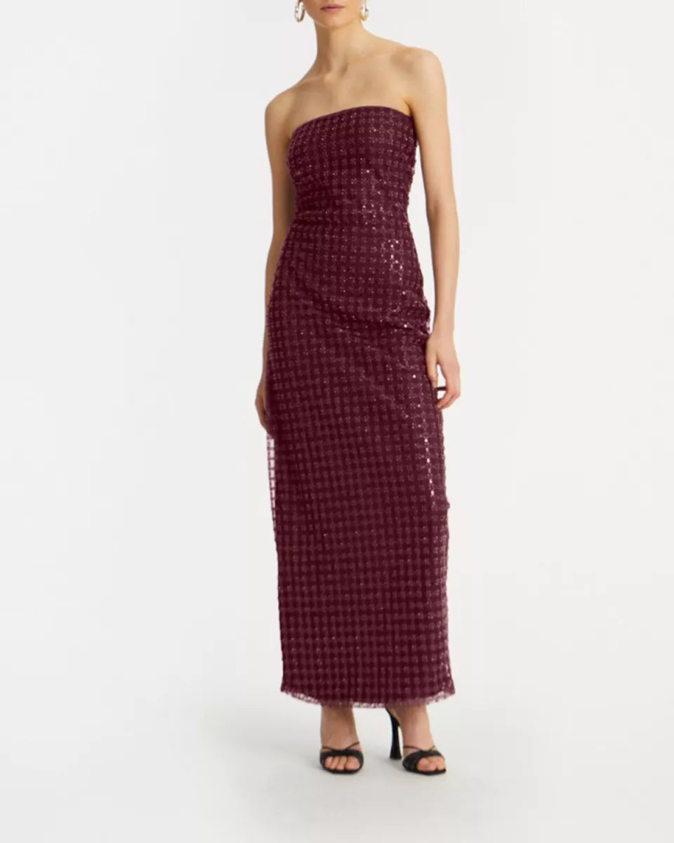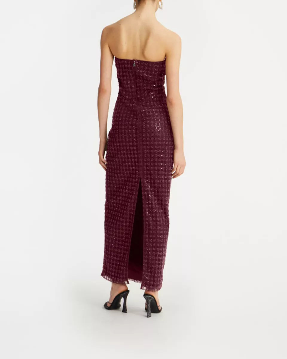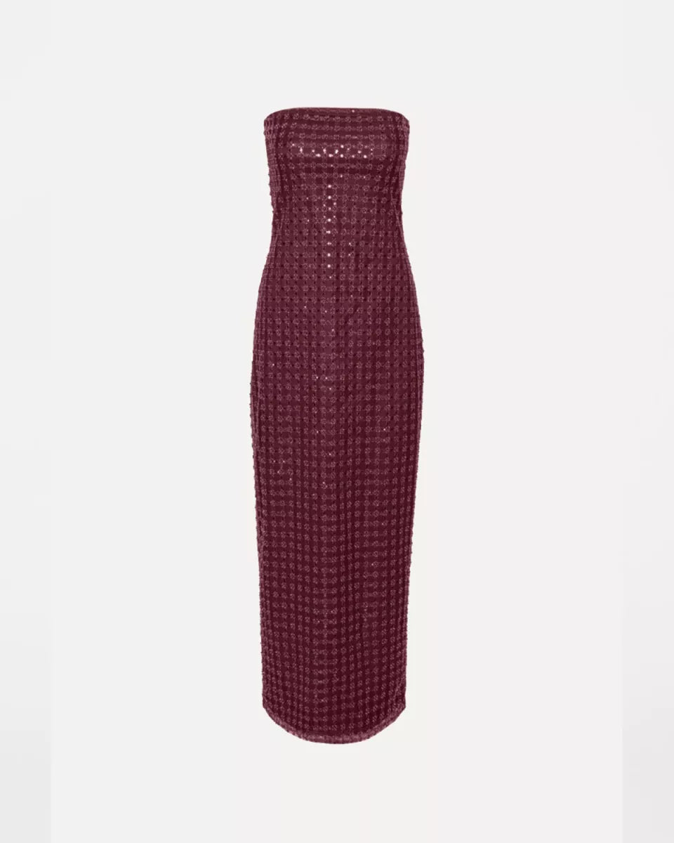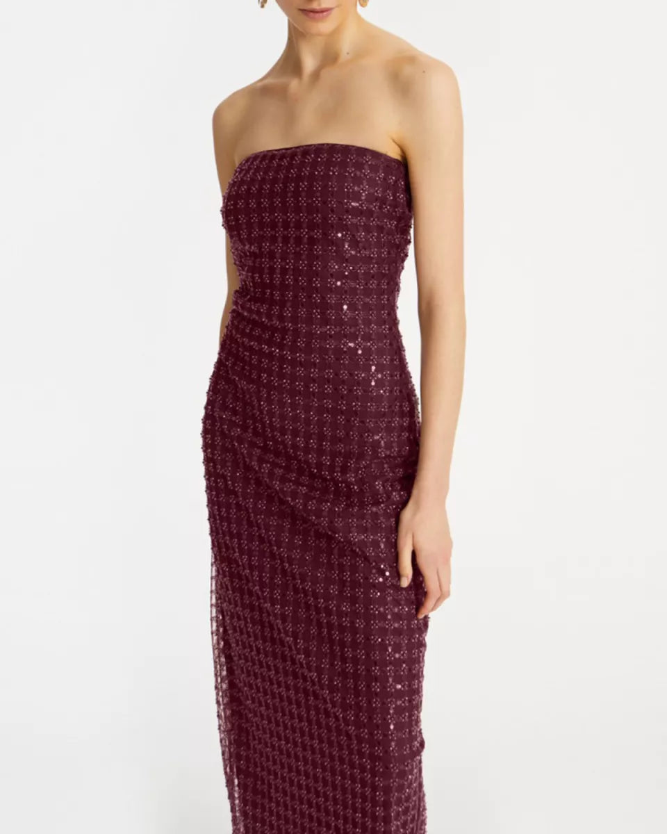 Strapless maxi dress in een diepe bordeauxkleur, volledig bezet met glinsterende beads. De rechte halslijn en aangesloten pasvorm zorgen voor een elegante look, terwijl de split achter wat bewegingsvrijheid en een extra detail geeft. Sluit onzichtbaar met een rits achter. Een echte eyecatcher voor een avond uit.