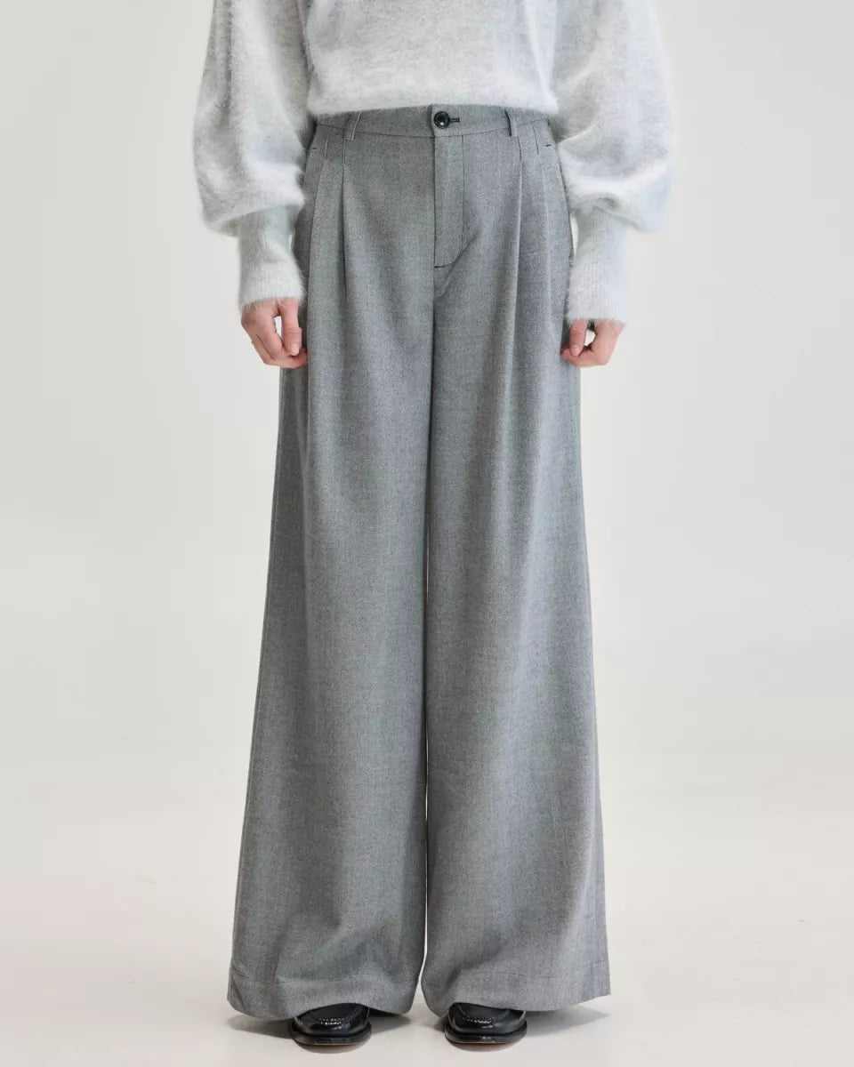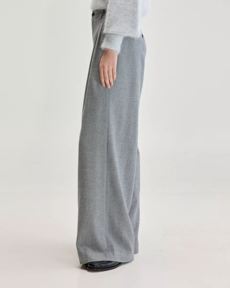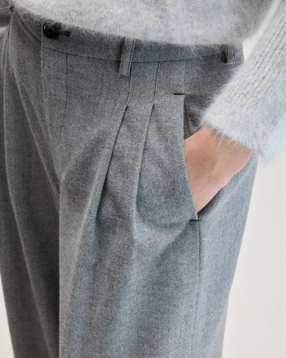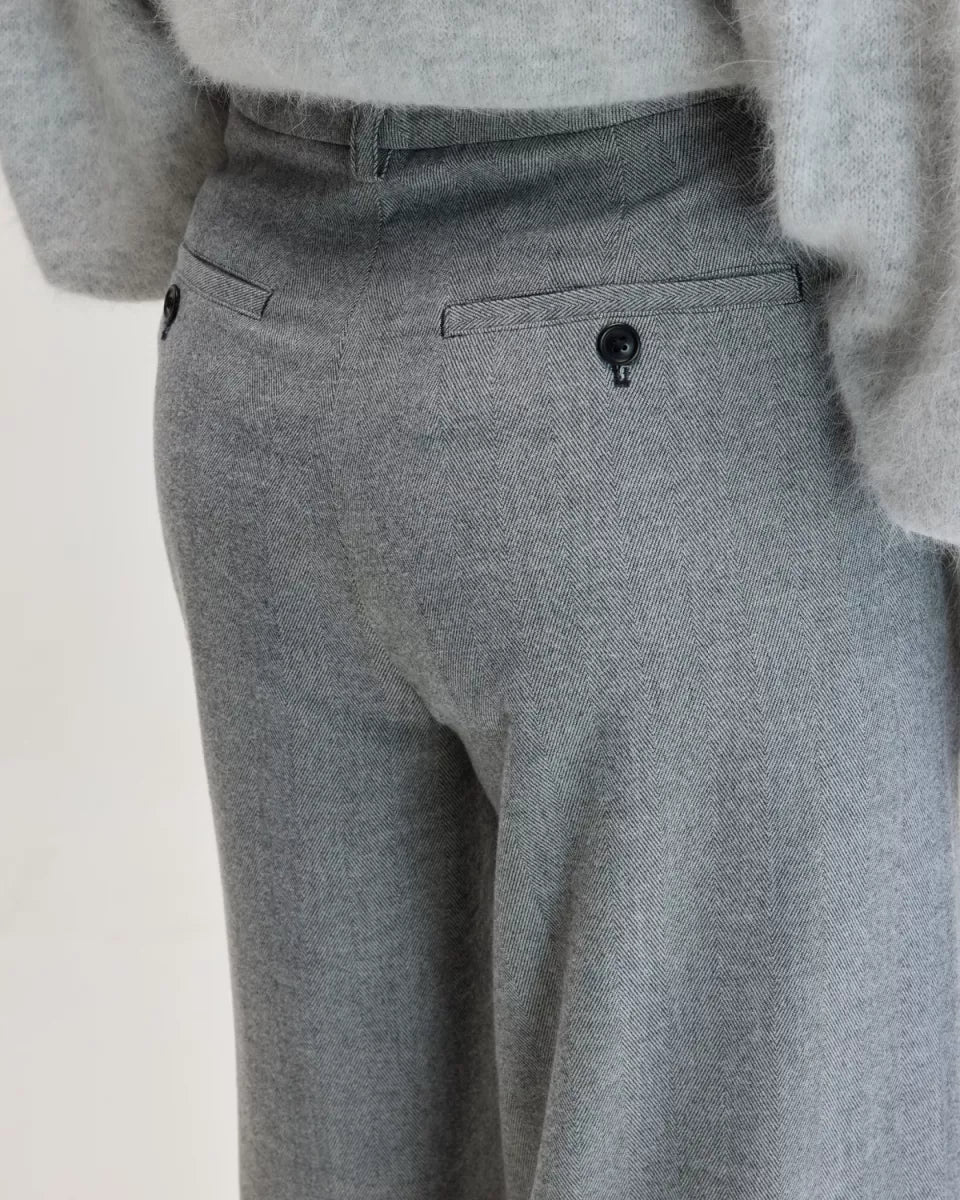 De Volkert Pant in lichtgrijs is een hoog uitgesneden broek met wijde pijpen en plooien aan de voorkant. Hij heeft een getailleerde pasvorm, riemlussen, en achterzakken met knopen voor een nette afwerking. De broek is perfect te combineren met een blouse of trui voor een stijlvolle, casual look.