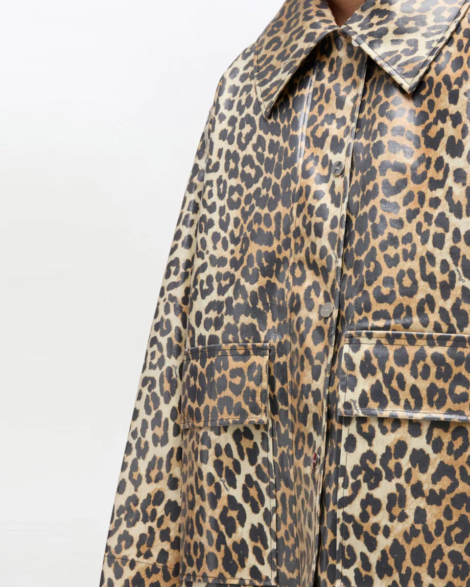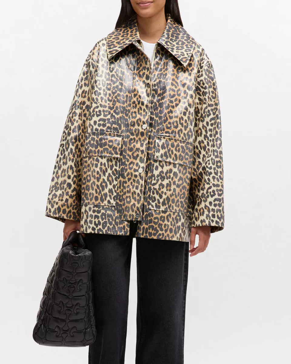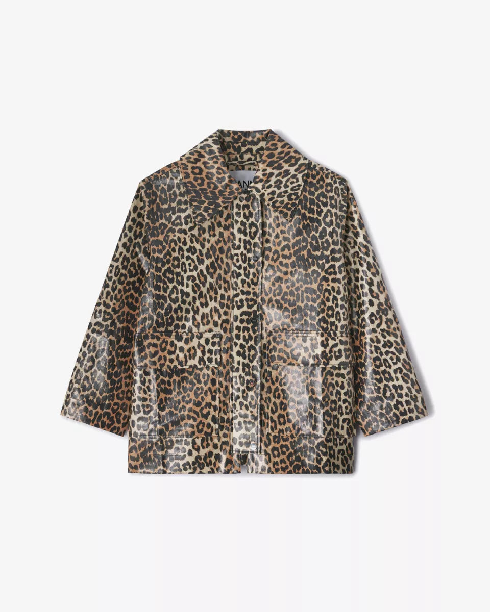 Ganni leminated cotton canvas jacket in bruin met all over luipaarddessin en een licht glanzende finish. De jas is gemaakt van gelamineerde canvas met 45% hennep, 37% biologisch katoen en 18% polyurethaan, wat zorgt voor een stevige feel en een oppervlak dat je makkelijk afneemt. Voorzien van een puntkraag, knoopsluiting en twee grote klepzakken op de voorkant. De pasvorm oogt recht en ruim met lange mouwen.
