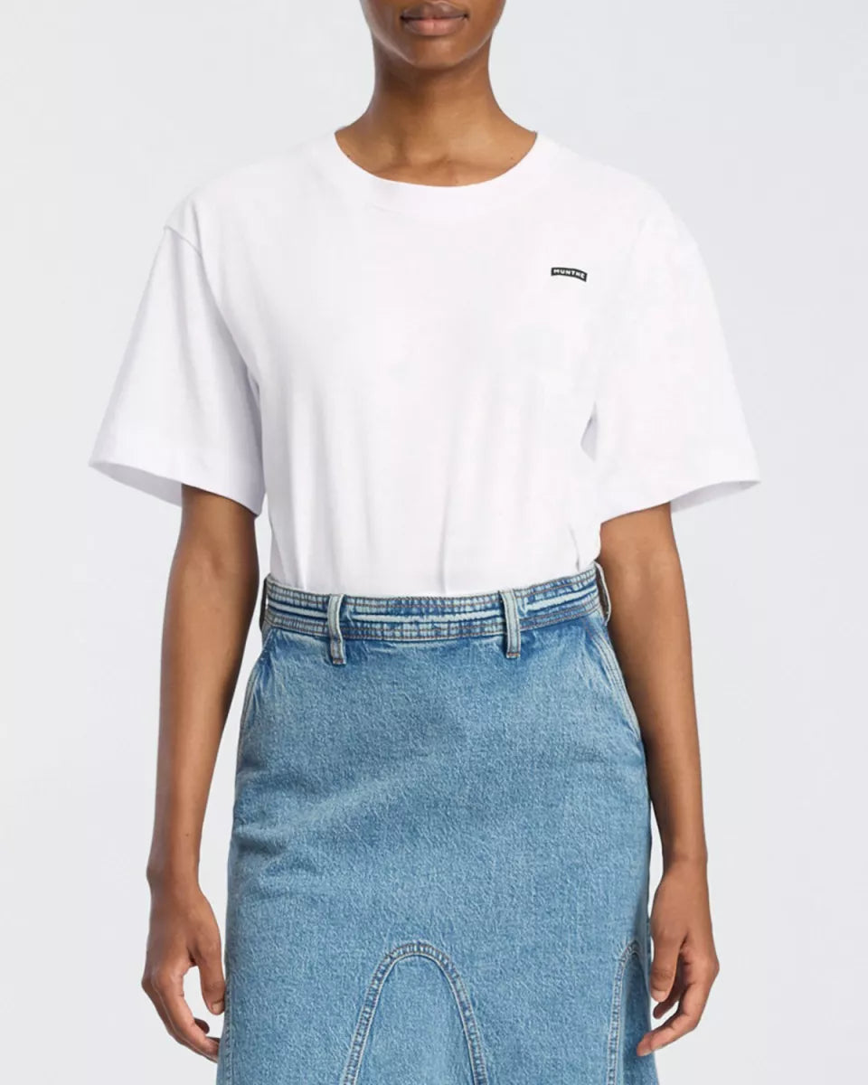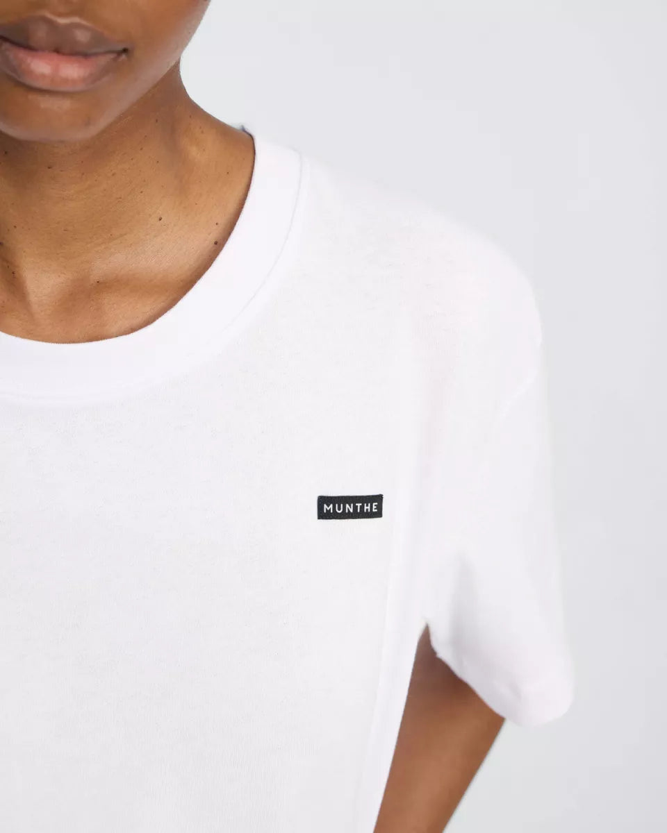 Wit Munthe T-shirt met een cropped lengte en een losse pasvorm. De ronde hals en korte mouwen geven een clean silhouet. Op de borst staat een klein MUNTHE logo. Gemaakt van 100% biologisch katoen met een zachte, ademende feel. Dit bellamy T-shirt is een wit T-shirt dat strak oogt onder een blazer, maar ook werkt als basic jersey top bij denim.