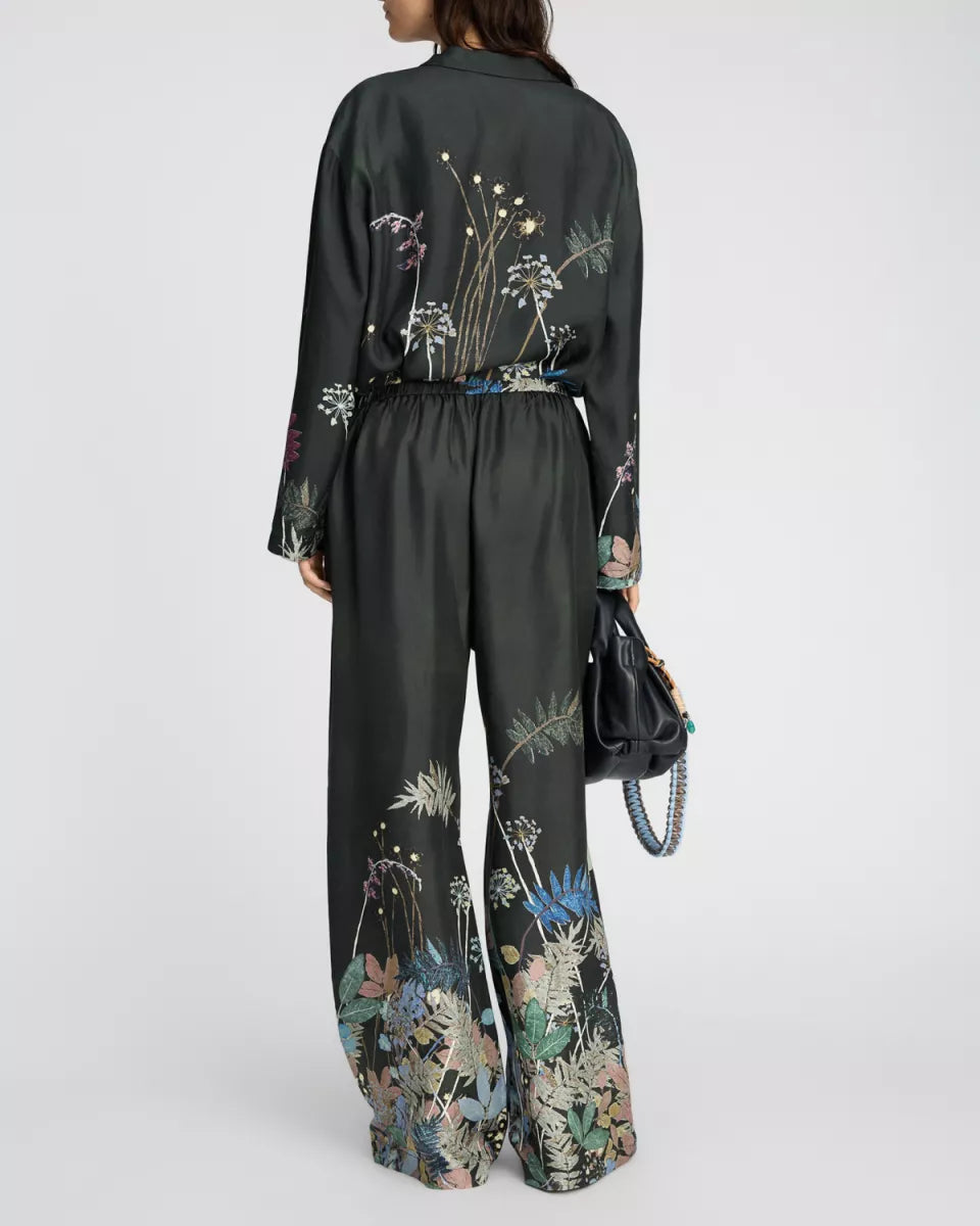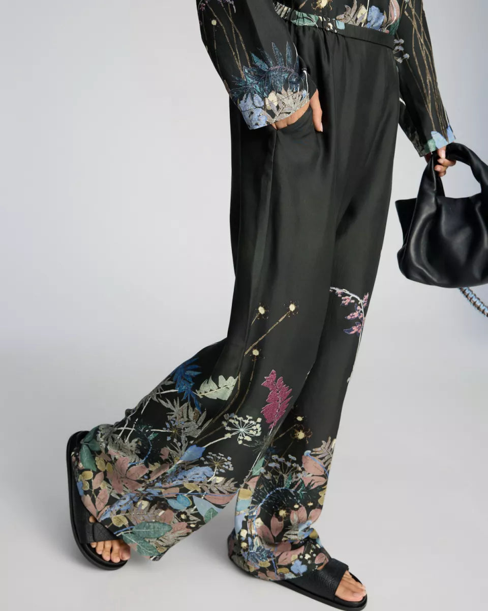 Fabert pants van Munthe in zwart, uitgevoerd in 100% zijde met een botanische print langs de pijpen. De broek heeft een losse, lange pasvorm en valt ruim. In de taille zit een strikkoord voor het afstellen van de fit. Afgewerkt met steekzakken en een gladde look met subtiele glans.
