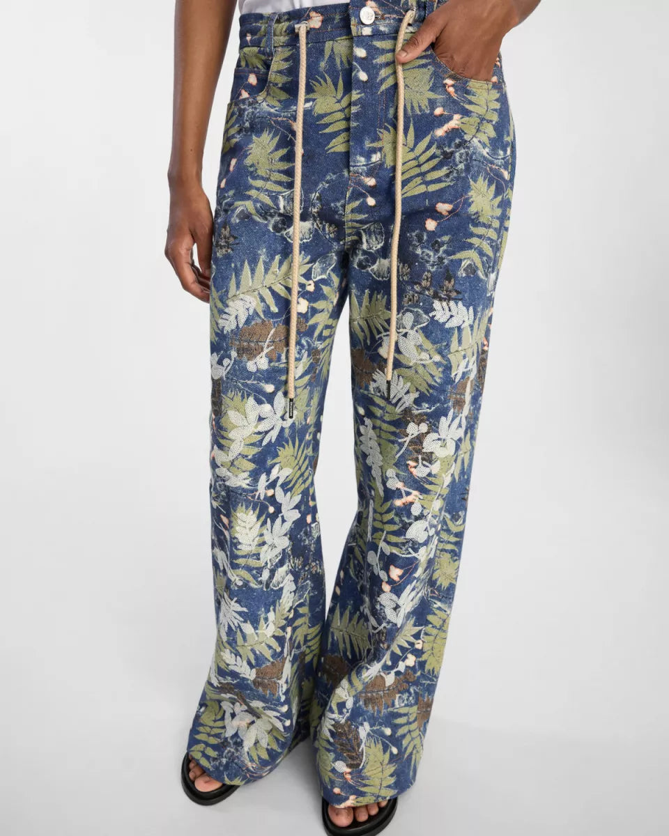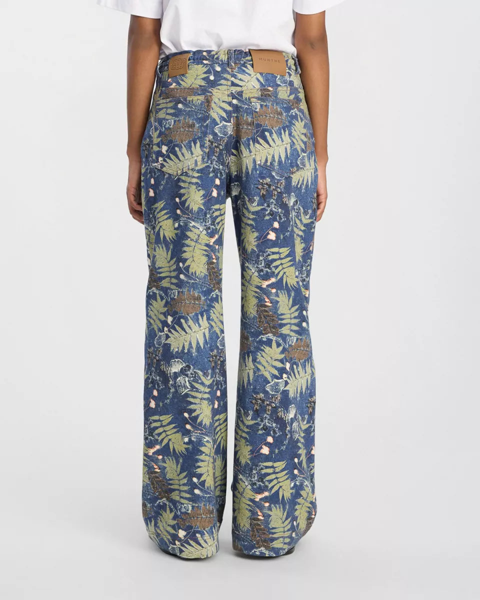 Obey pants van Munthe is een indigo jeans met all over botanische print. De denim voelt soepel aan en draagt licht. In de taille zit een striksluiting met koorden, afgewerkt met een gulp. Het model heeft een high waist en wijde, lange pijpen. Voor en achter zitten opgestikte zakken en achterop is een leren logopatch geplaatst.