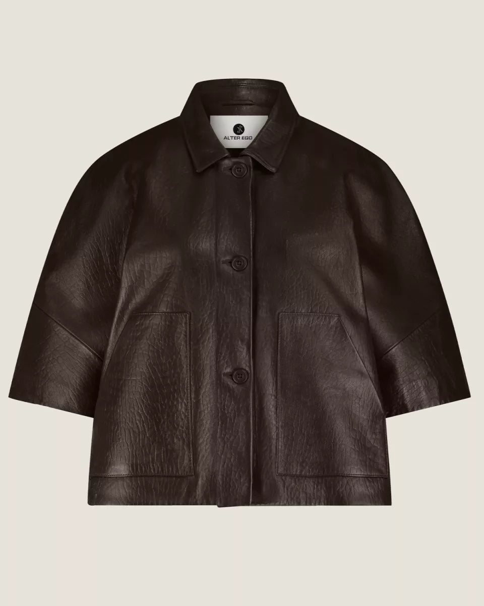 Modern, oversized leren jack van zacht schapenleer. Met verlaagde schouders en knoopsluiting voor een tijdloze maar moderne look. De grote steekzakken zijn praktisch en maken het jack extra comfortabel, terwijl de gestructureerde vorm het seizoen na seizoen stijlvol houdt (ook verkrijgbaar in bordeaux).