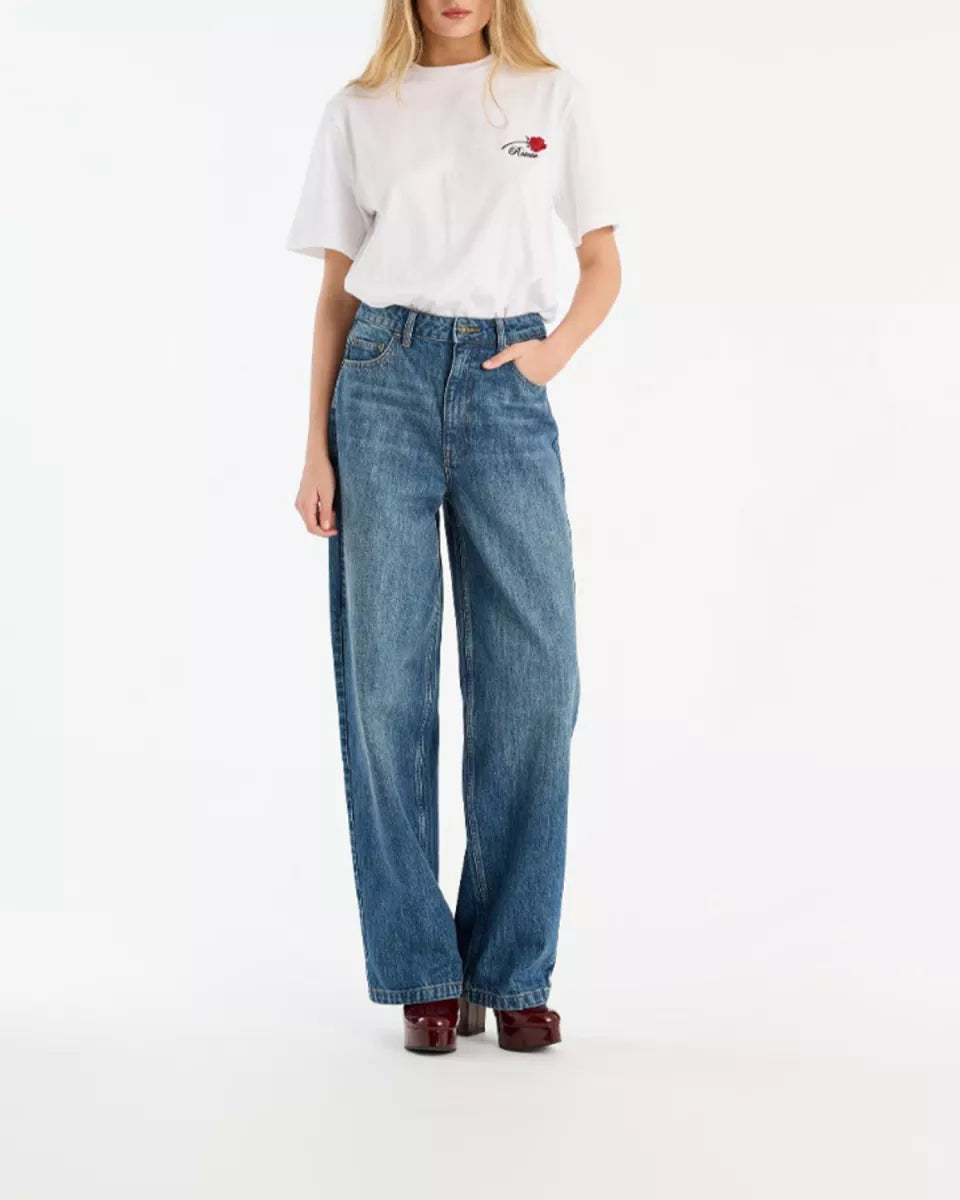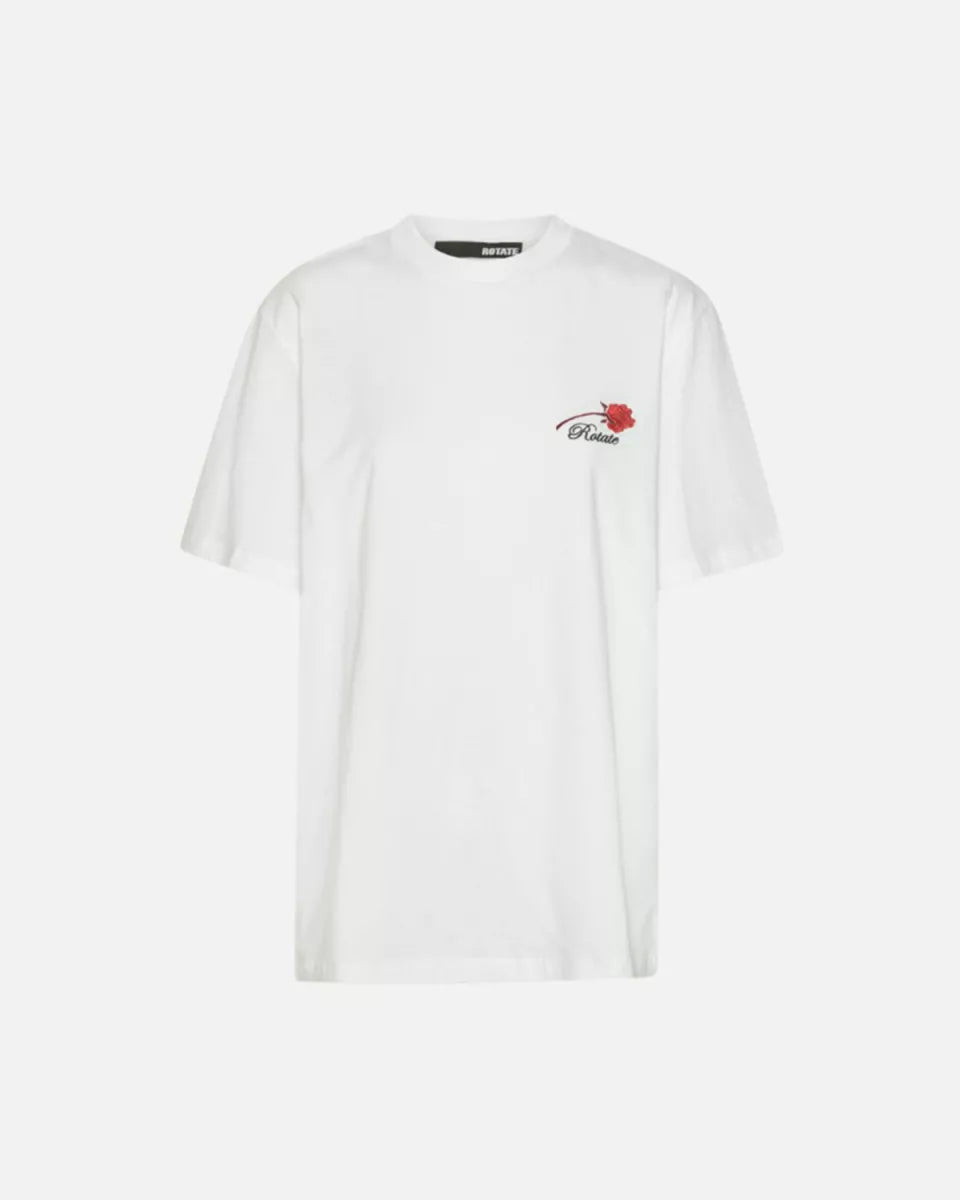 Dit T-shirt is een lekkere basic in helderwit van zacht organisch katoen, met ronde hals en korte mouwen. Op de zit borst een klein rood roosje met ROTATE embroidery. Relaxed en oversized, super makkelijk te combineren.