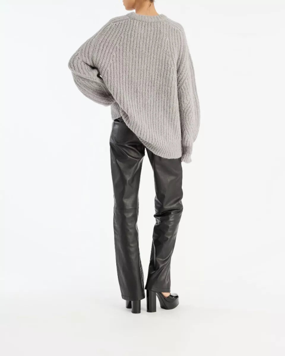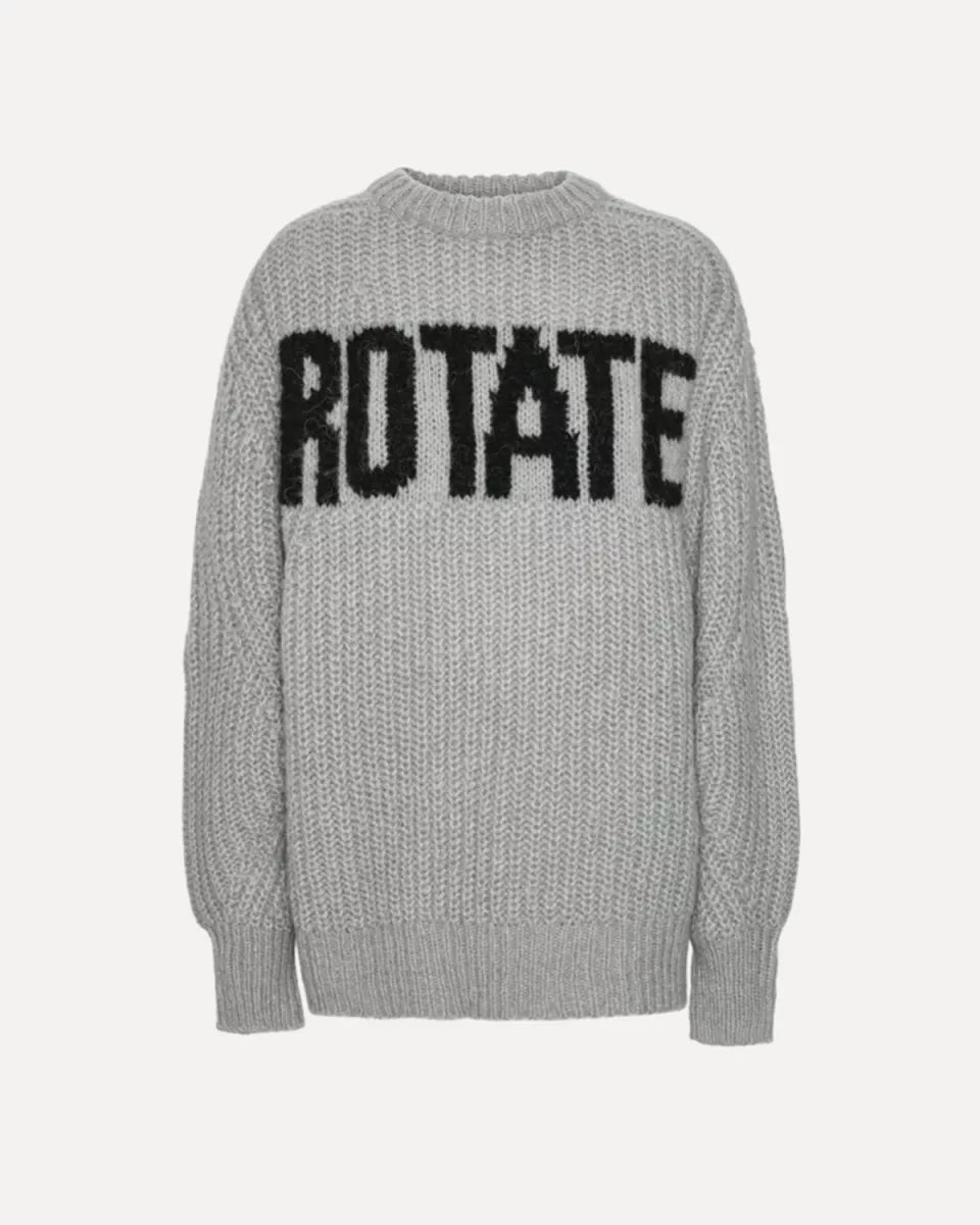 Grijze gebreide trui met een chunky structuur en een relaxed, oversized pasvorm. Het zwarte ROTATE-logo op de borst geeft ’m een opvallende look. Leuk om te dragen op een leren broek of met een jeans voor een casual vibe.