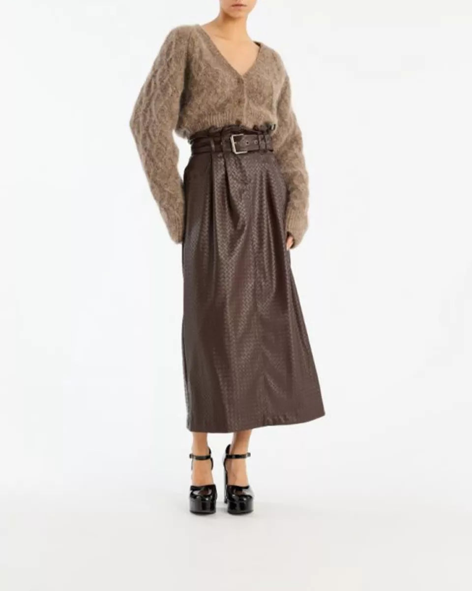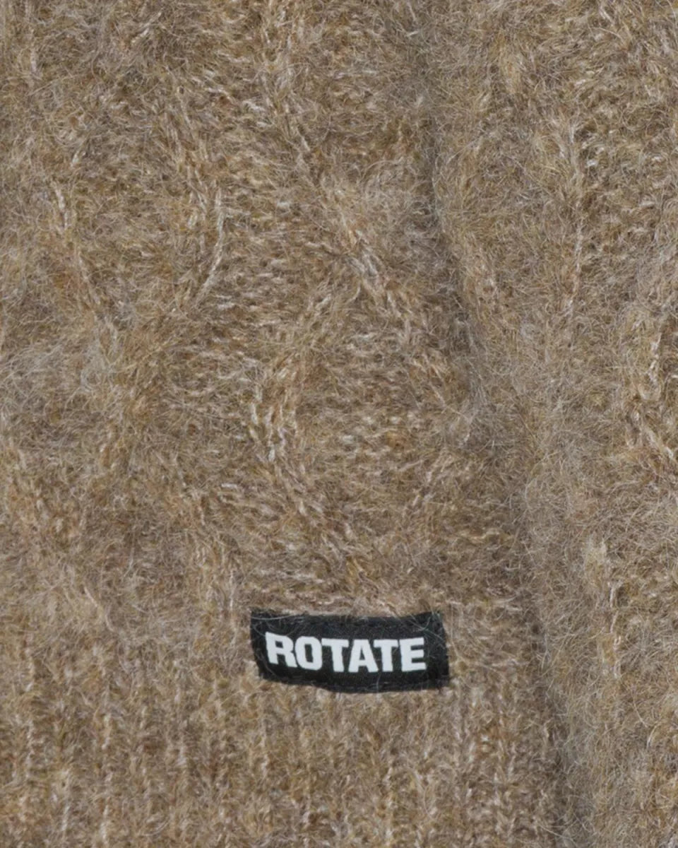De Fluffy Knit Cardigan is een heerlijk zachte, cropped cardigan in bruin met een diepe V-hals en knoopsluiting aan de voorkant. De trui heeft een diamantpatroon in de kabels, lange mouwen met geribde boorden en een klein ROTATE-label aan de linkerkant boven de taille (ook verkrijgbaar als sweater).