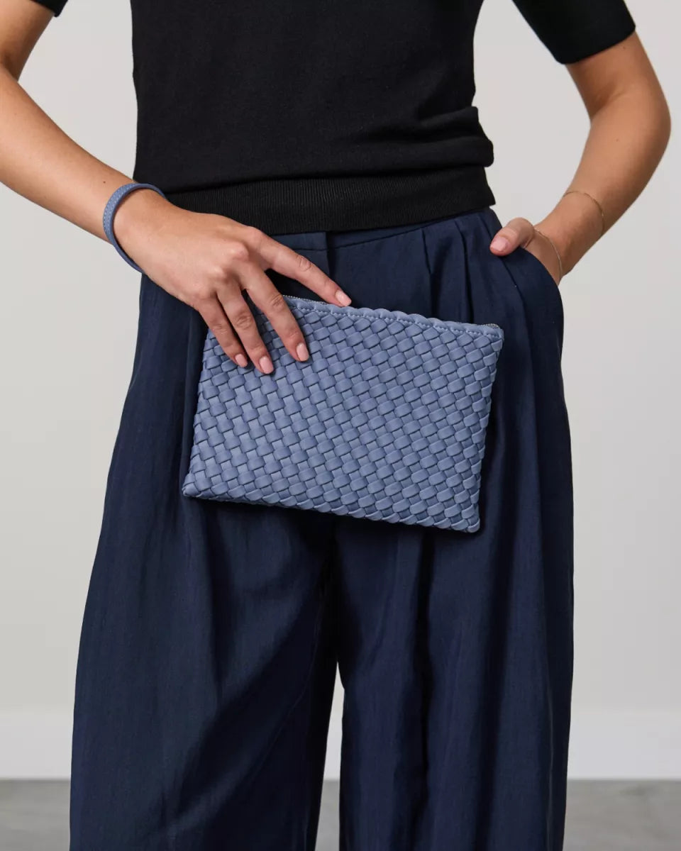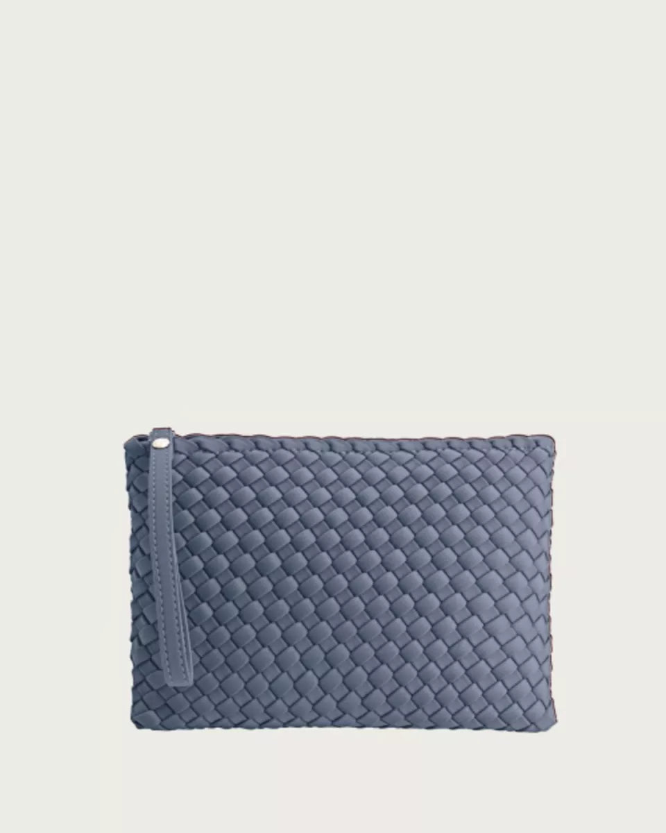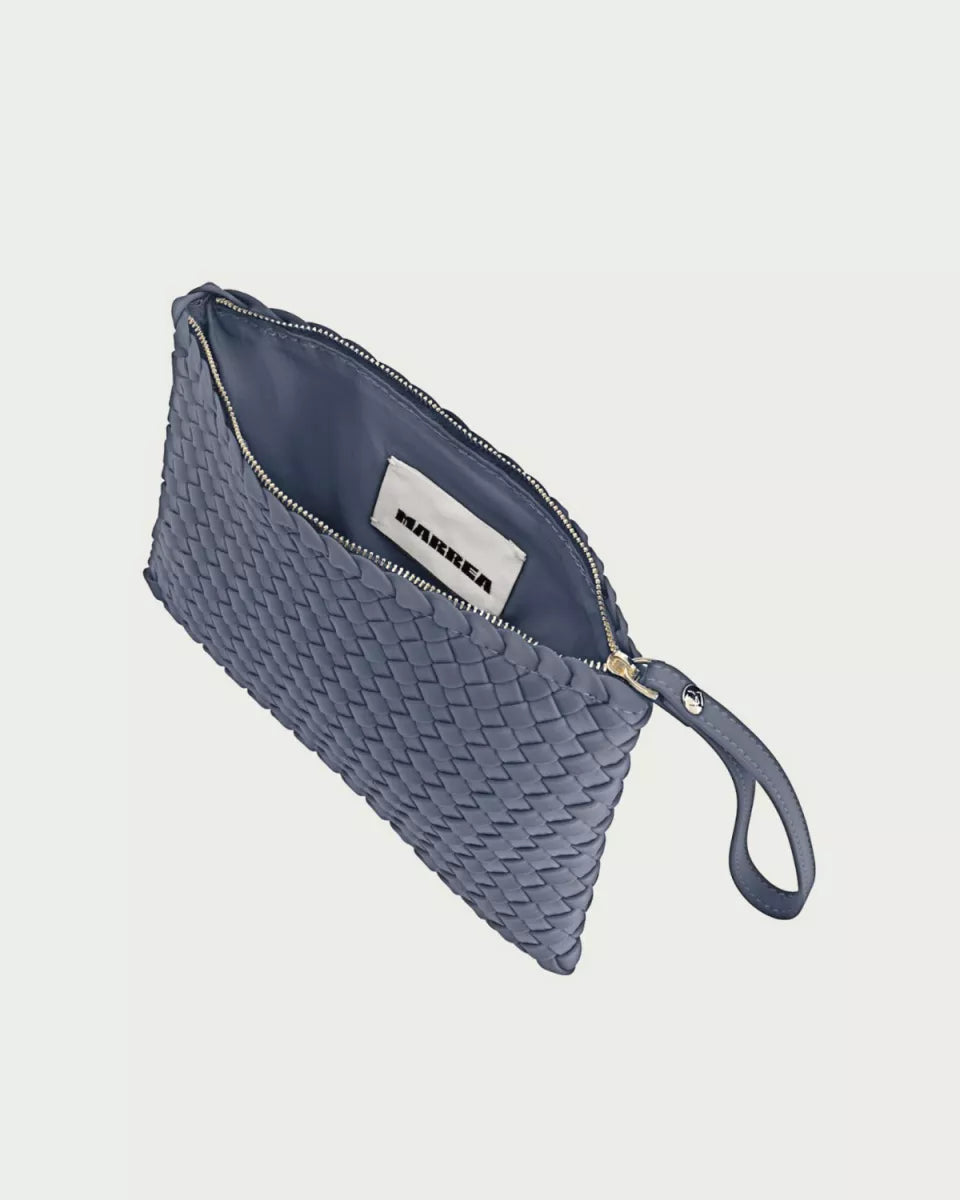 Lichtblauwe Marrea clutch met een volledig gevlochten structuur en een strak, rechthoekig silhouet. De tas is gemaakt van neopreen en voelt soepel aan, zodat je hem prettig in de hand houdt. Bovenaan sluit je de clutch met een goudkleurige ritssluiting. Aan de zijkant zit een polsbandje, handig als je je handen even vrij wilt hebben. Het hoofdvak biedt ruimte voor je telefoon, sleutels en kleine essentials.