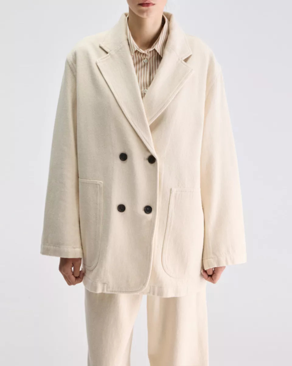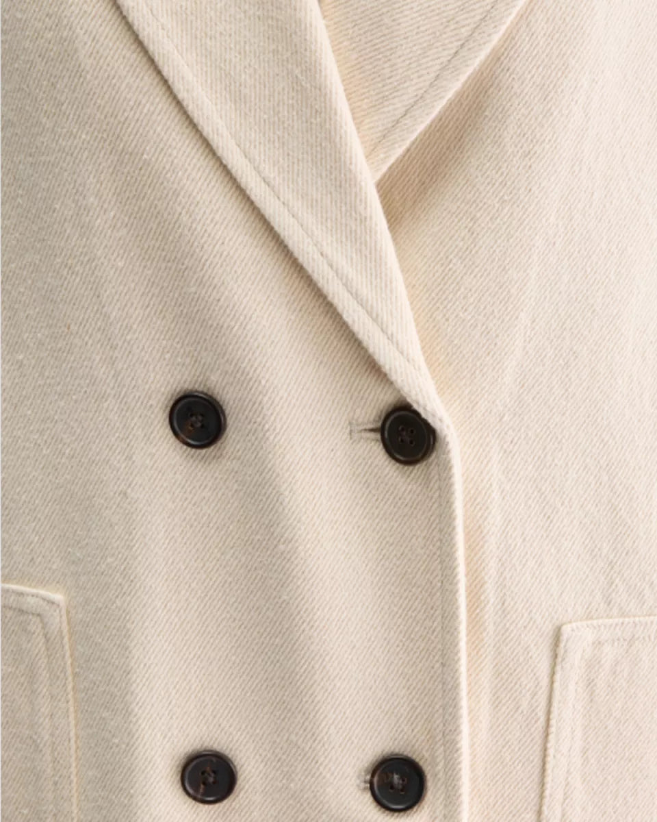 Bellerose Jazzy Blazer in Ivoor is een double breasted blazer in 100% katoen met een canvas look. Het ontwerp heeft brede revers, lange mouwen en een rechte, iets oversized pasvorm. De voorkant sluit met knopen en is afgewerkt met grote opgestikte zakken. De blazer oogt clean en casual, en past goed binnen een moderne garderobe met een rustige, nuchtere uitstraling.