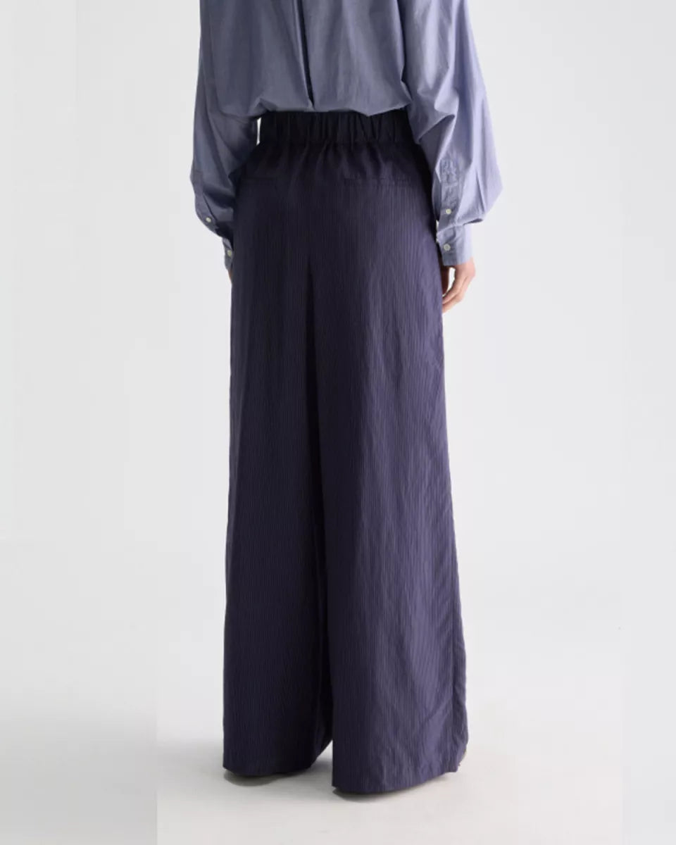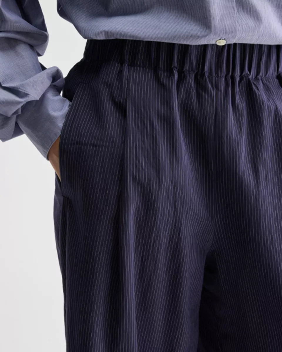 Vespa61 pants van Bellerose met een fijne verticale streep in donkerblauw en wit. De broek heeft een elastische tailleband en een wide leg met een relaxed fit. Aan de zijkant zitten paspelzakken. De stof voelt soepel aan en beweegt licht mee, wat prettig draagt bij langere dagen.