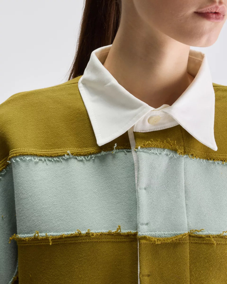 Oversized rugby-sweatshirt van Bellerose met brede Khaki en licht mintgroene strepen en ruwe naaddetails op de overgangen. Het katoen voelt zacht aan en draagt comfortabel. Afgewerkt met een witte poplin kraag en een verborgen knoopsluiting aan de hals. Lange mouwen met geribde manchetten en een geribde boord onderaan.