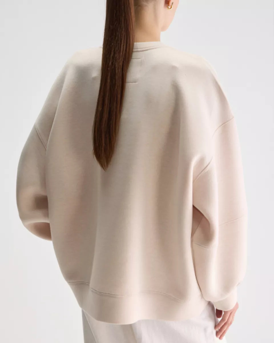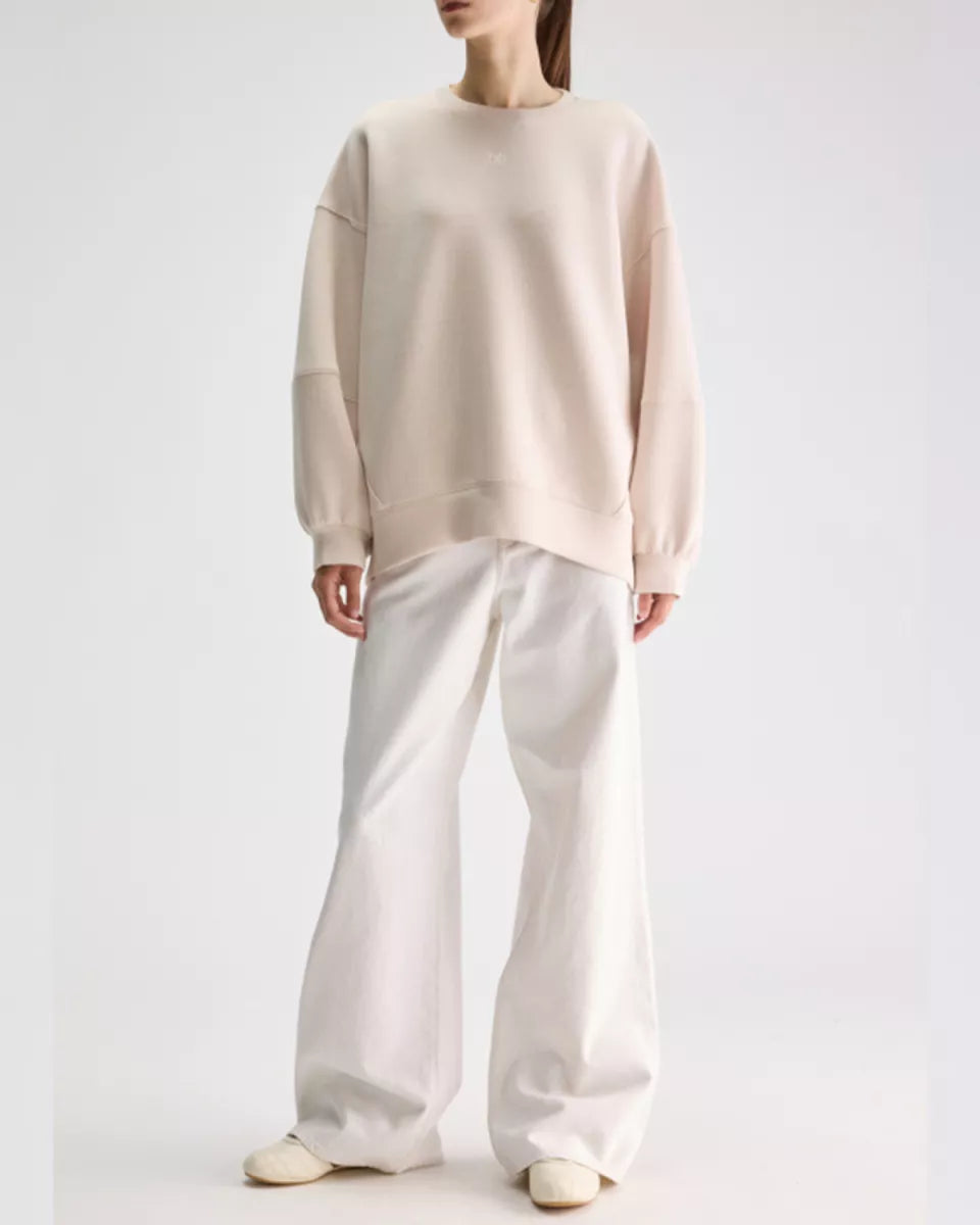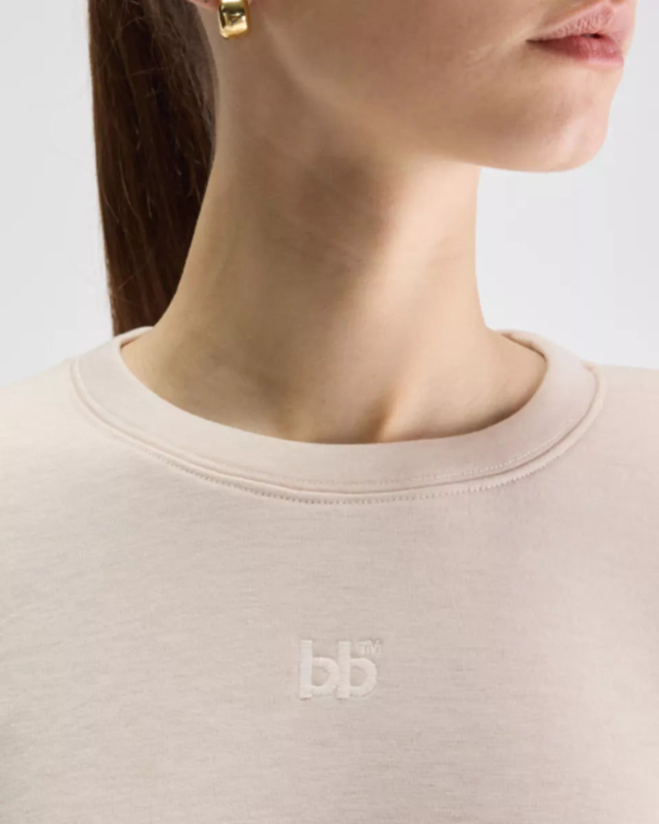 Trig61 is een ecru Bellerose sweatshirt met ronde hals en lange mouwen. Het jersey materiaal bestaat uit 100% polyester en voelt glad en licht aan, met een vormvaste uitstraling die snel droogt. De pasvorm is iets oversized met verlaagde schoudernaden. Op de borst staat een tonale geborduurde “bb” en de afwerking is voorzien van ribboorden bij hals, manchetten en zoom.