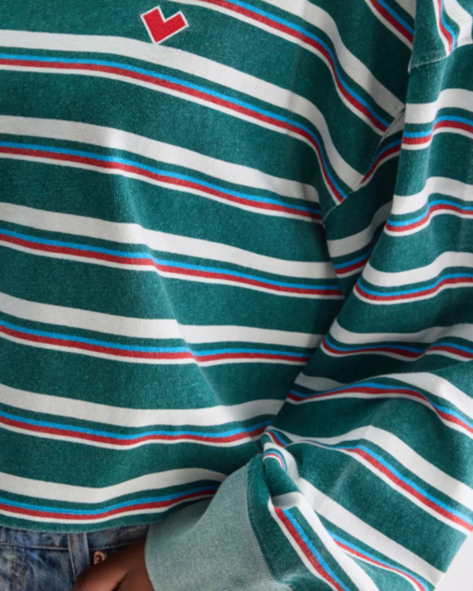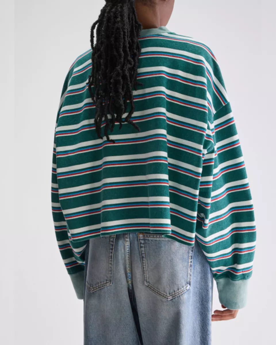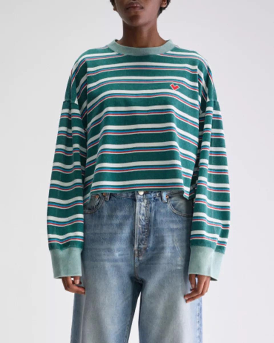 Blauw gestreept Franto61 shirt van Bellerose in katoenen jersey met een middelzware feel. Het ontwerp heeft een ronde hals, lange mouwen en brede boorden bij de manchetten. Op de borst zit een kleine geborduurde patch. De snit oogt oversized en cropped, waardoor de mouwen ruim vallen en het lijf korter eindigt.