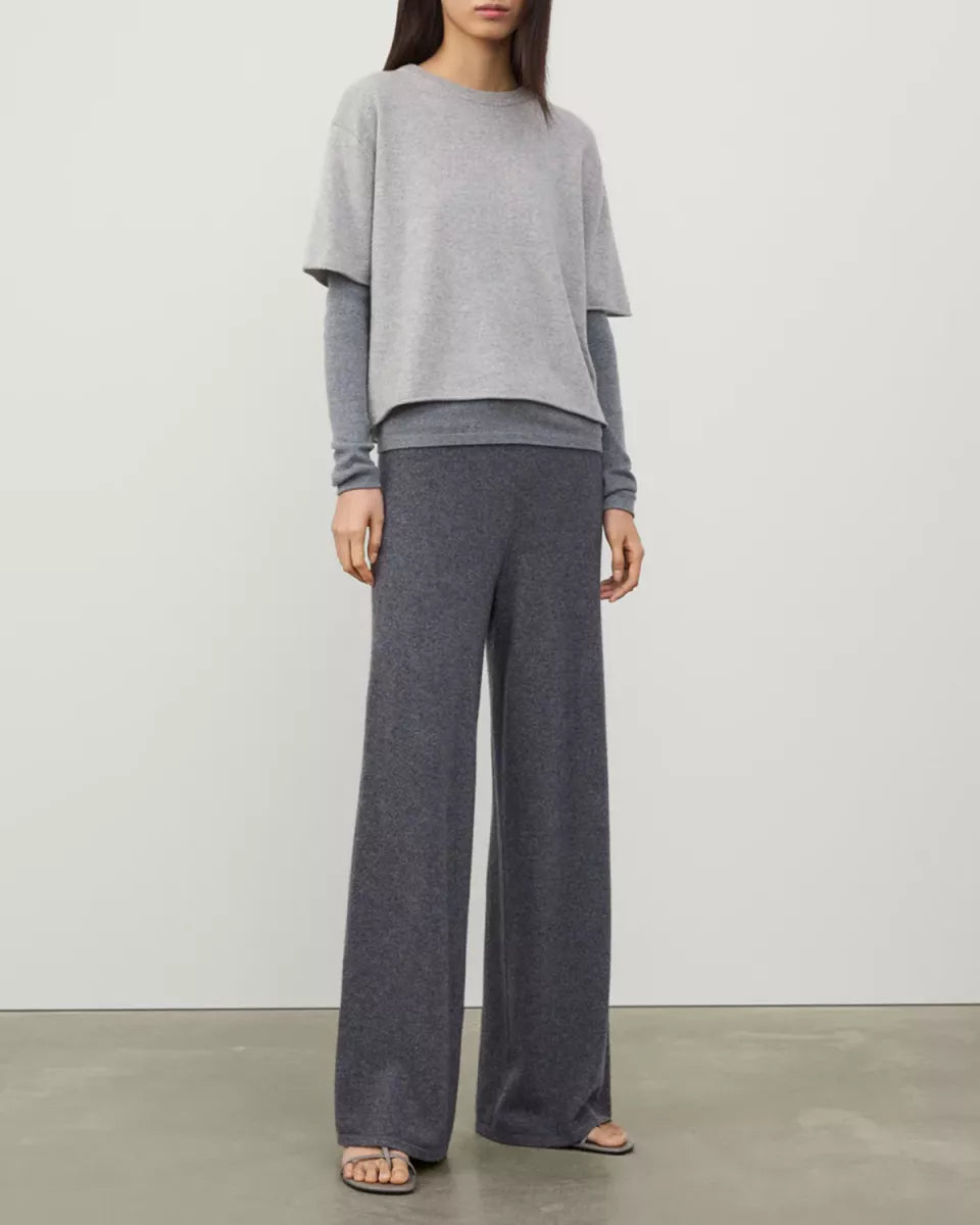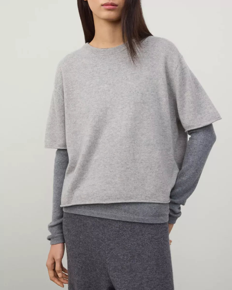 Cila is een grijs melange Lisa Yang T-shirt van zachte cashmere dat prettig aanvoelt op de huid. De top heeft een ronde hals, korte mouwen en een licht cropped lengte. De schouders vallen iets lager en de zoom is subtiel gerold, wat het breisel een rustige afwerking geeft. Dit cashmere T-shirt is geschikt als knit tee om los te dragen of als laagje onder een vest of blazer.