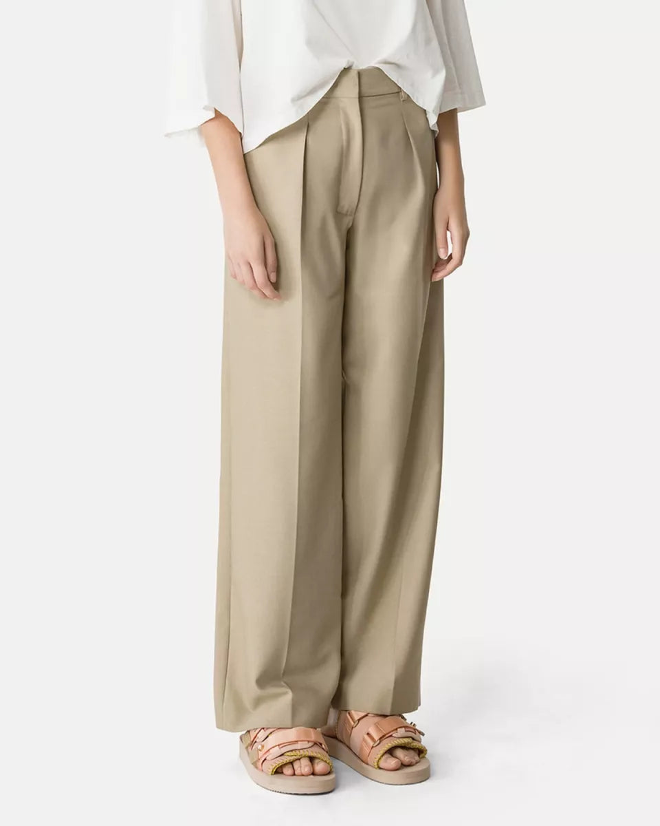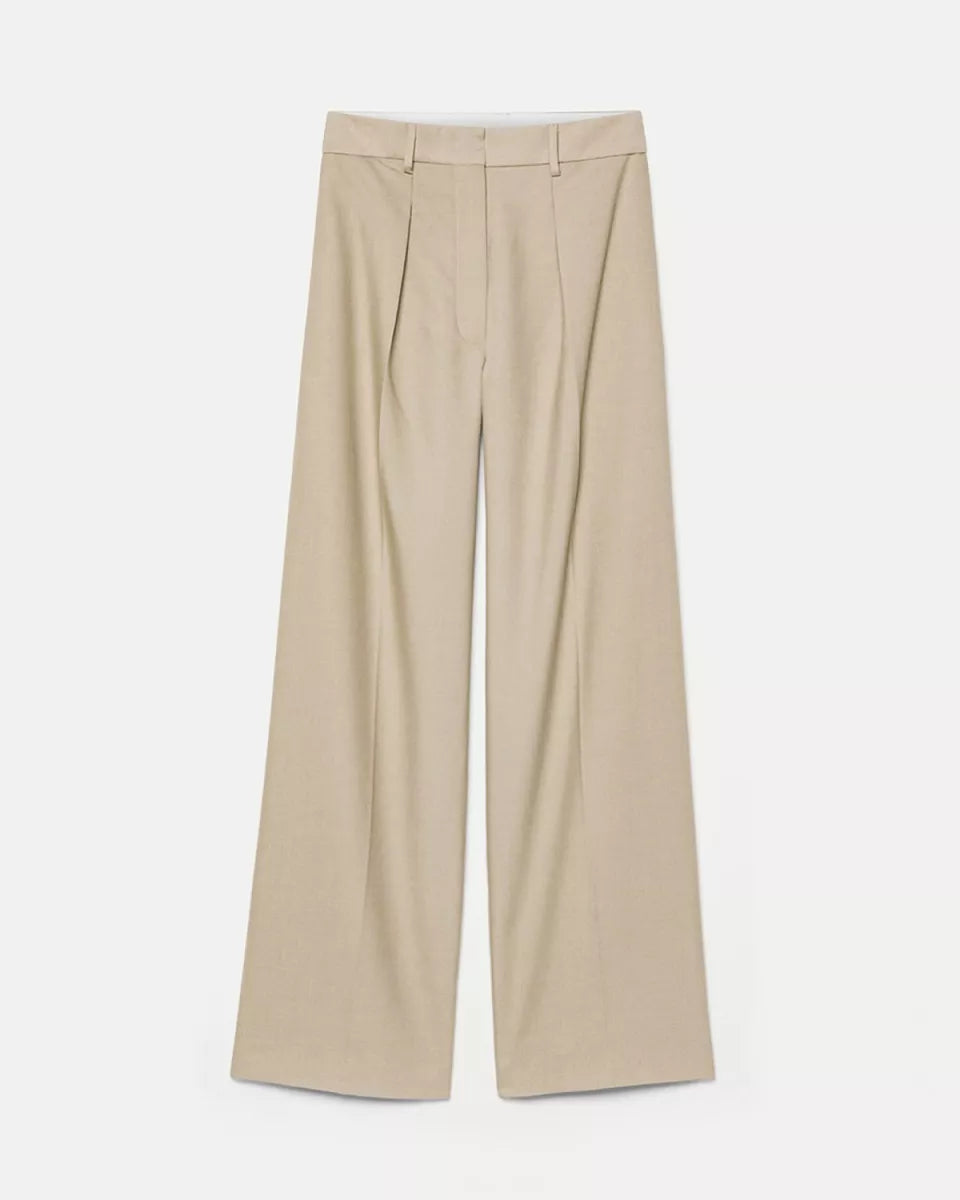 Forte Forte Grain de Poudere Highwaist Pant is een zandkleurige pantalon met hoge taille en wijde pijpen. De stof is een wolblend met een herkenbare grain de poudre structuur. De voorkant is afgewerkt met plooien voor een nette, rechte belijning. De sluiting bestaat uit een blinde haak en rits. De broek is ongevoerd en valt soepel langs het been.