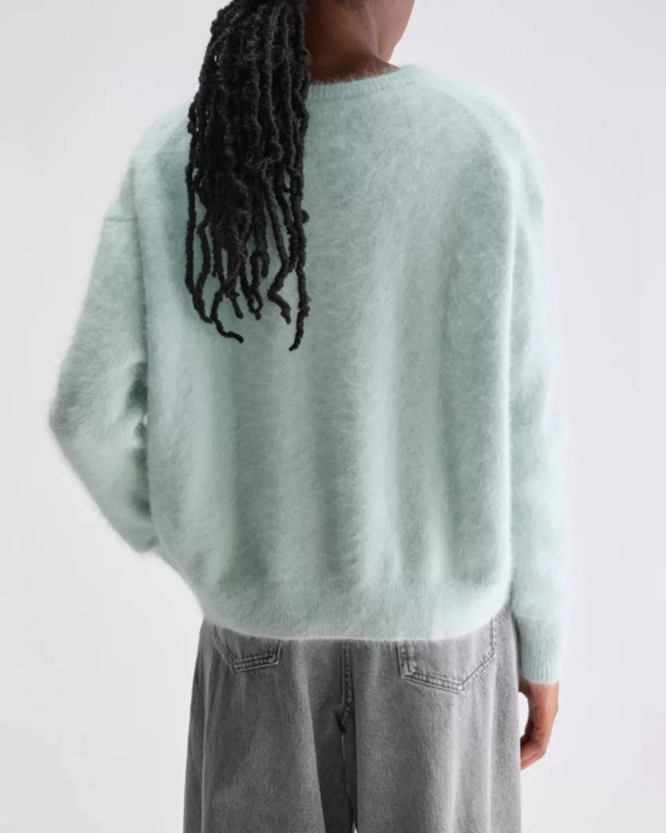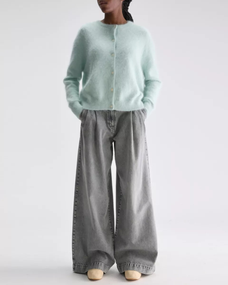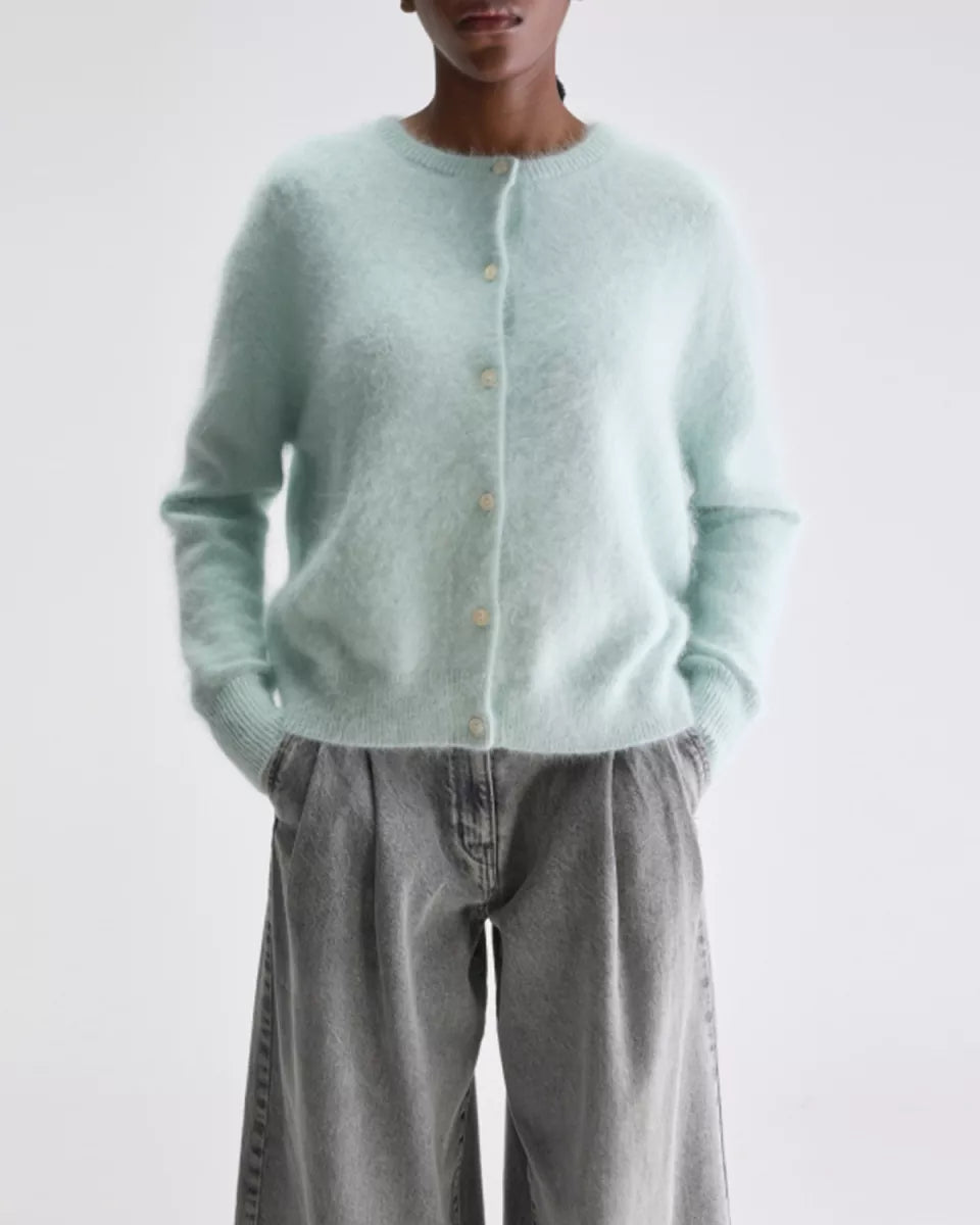 Dathan is een lichtgroene Bellerose cardigan in knitwear met een zachte angoramix die licht aanvoelt op de huid. Dit vest heeft een ronde hals, lange raglanmouwen en ribboorden aan de hals, manchetten en zoom. De knoopsluiting met kleine knopen loopt middenvoor. De breistructuur is effen en uitgevoerd in een medium gauge.