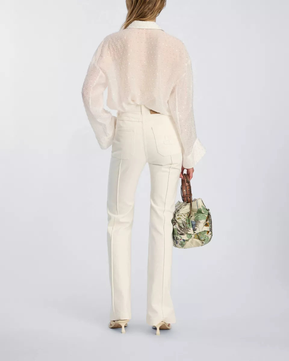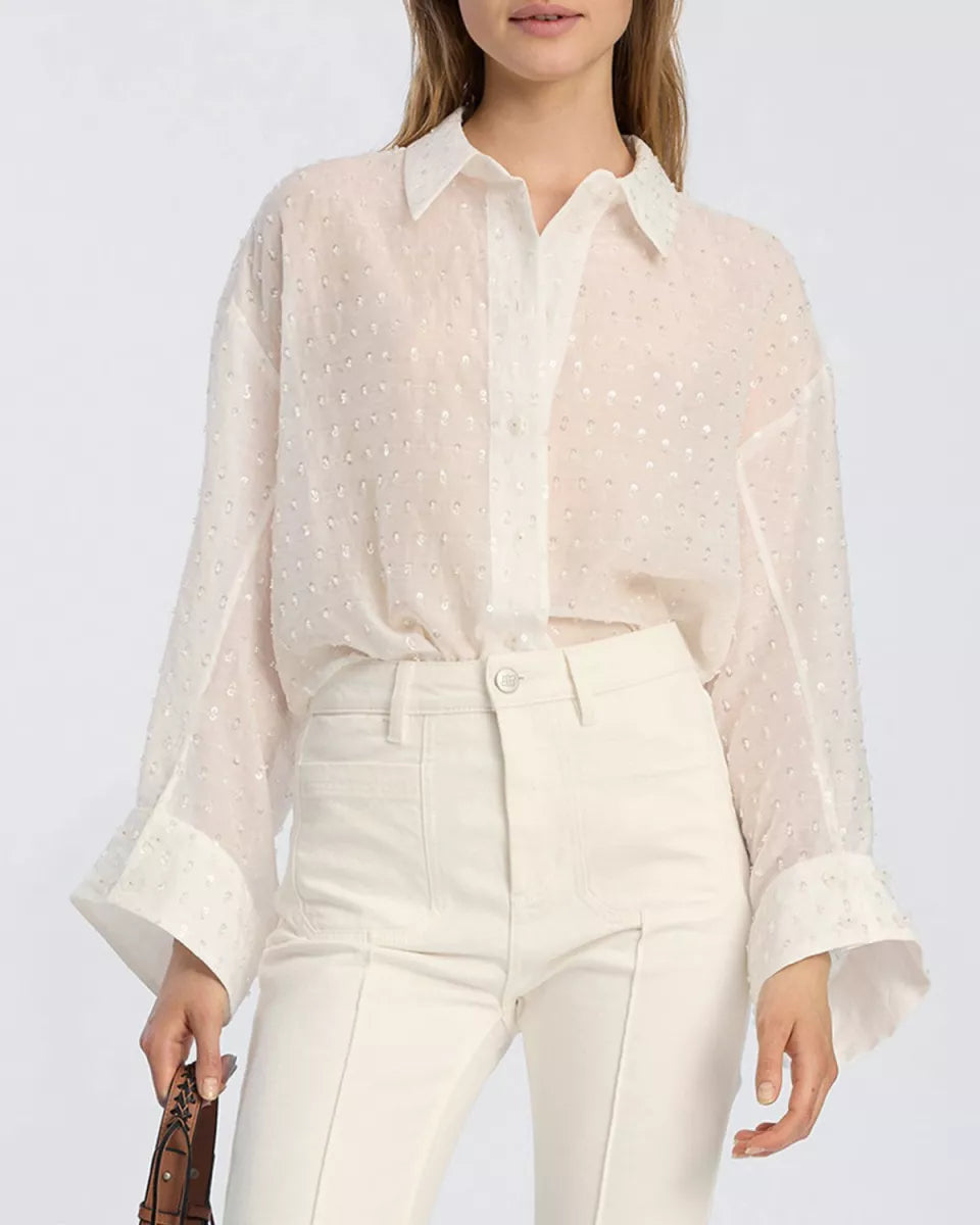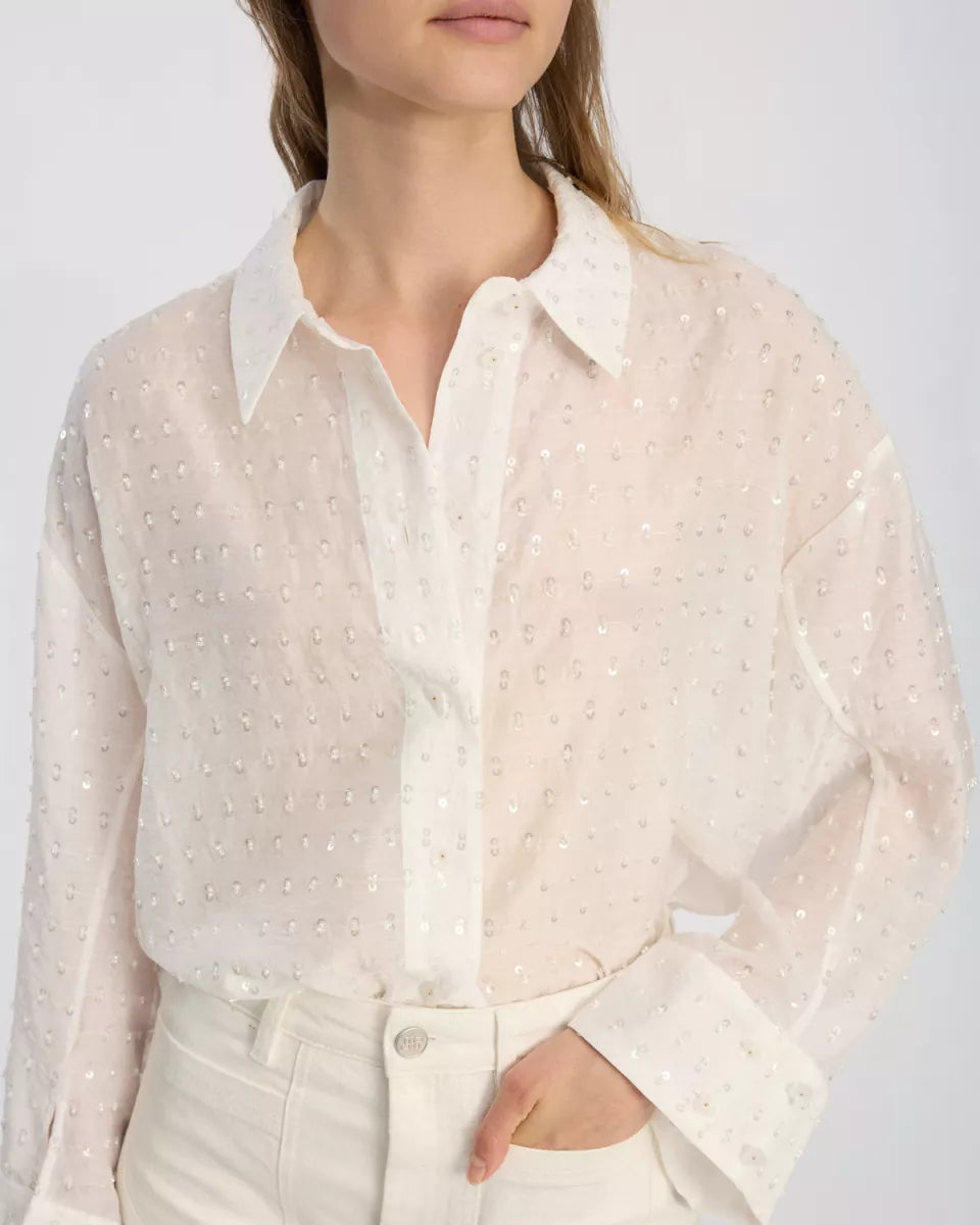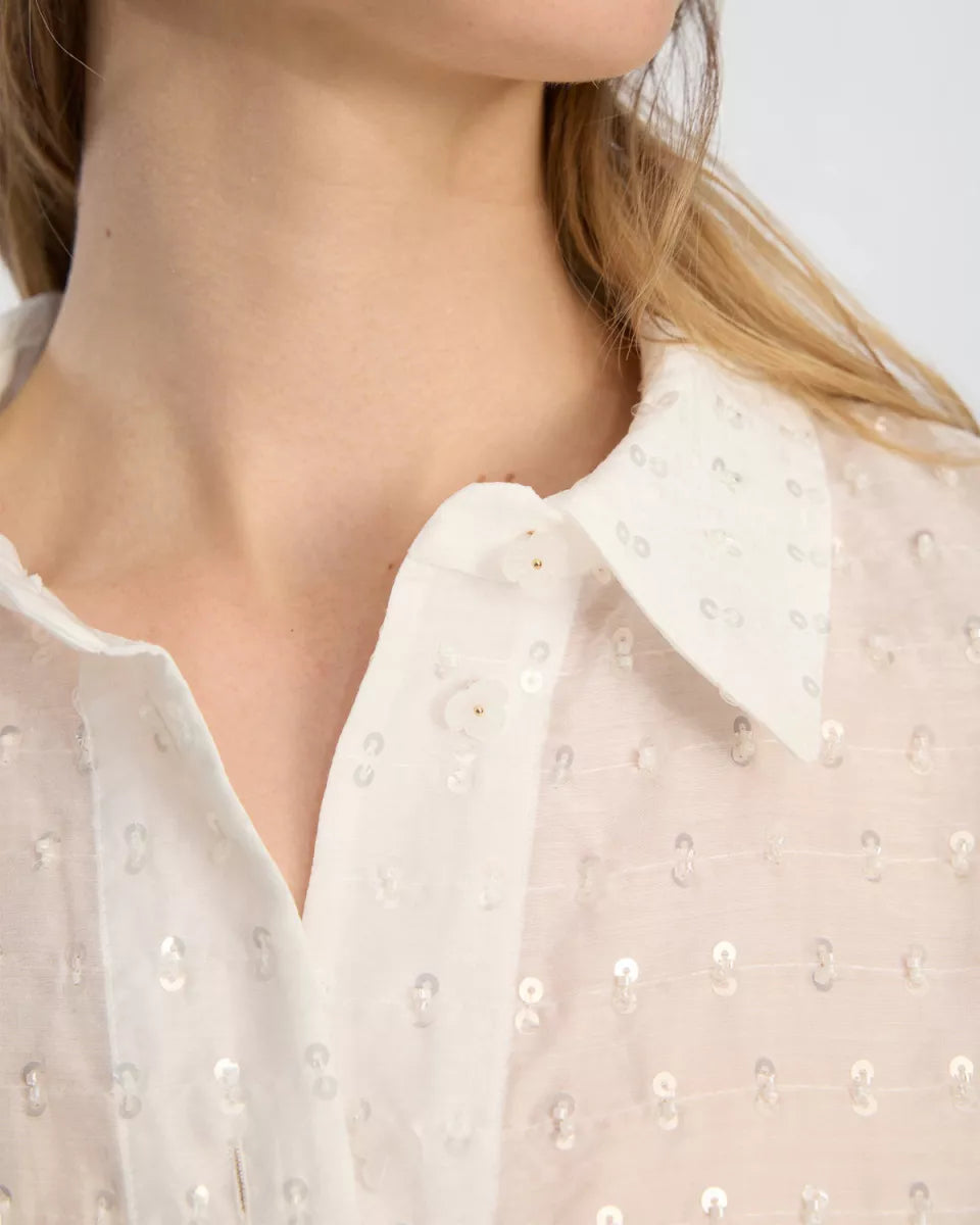 Ivoor blouse van Munthe met een semi transparante stof en ingeweven stipstructuur. Het model heeft een klassieke kraag en een doorlopende knoopsluiting aan de voorkant. De lange mouwen zijn ruim gesneden en afgewerkt met brede manchetten. De rechte zoom maakt de Bjarka Blouse geschikt om los te dragen of in een broek of rok te stylen.