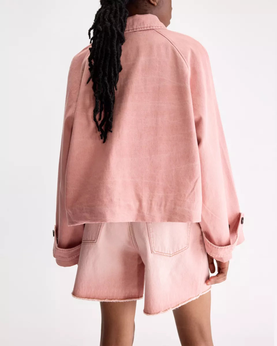 Jessy is een denim jacket van Bellerose in de kleur roze. De katoenen denim voelt stevig aan en draagt prettig door de volledig katoenen voering. Het jack heeft een kraag, raglanmouwen en een blinde knoopsluiting aan de voorkant. Aan de zijkant zitten steekzakken en op de schouders zijn epauletten zichtbaar. De onderzijde is afgewerkt met een tunnelkoord voor een verstelbare look.