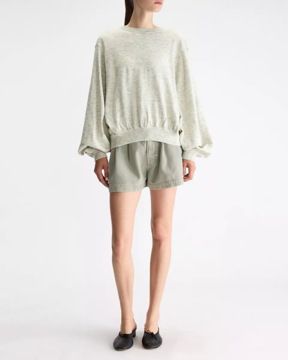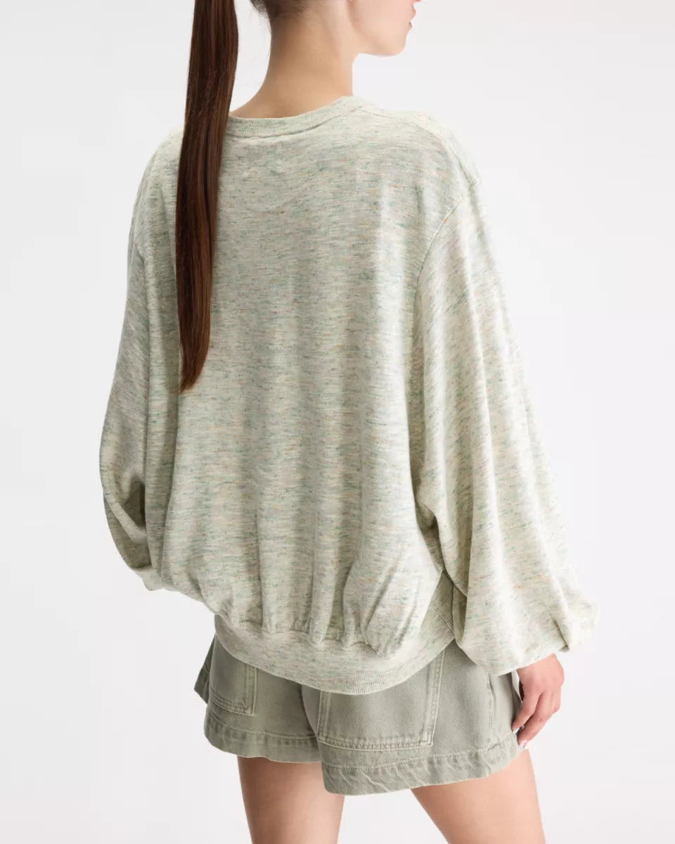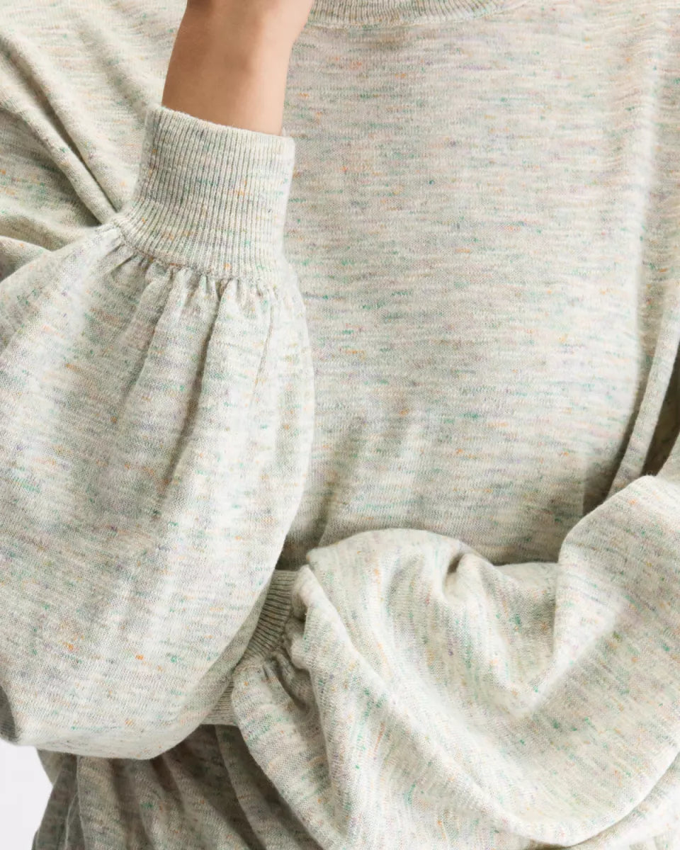 Deze ecru Bellerose sweater heeft een ronde hals en een losvallende pasvorm met verlaagde schoudernaden. De lange mouwen zijn ruim ingezet en sluiten aan bij de manchetten. Onderaan zit een brede ribboord die licht aansluit. De gemêleerde knitwear look geeft een rustige, casual uitstraling.