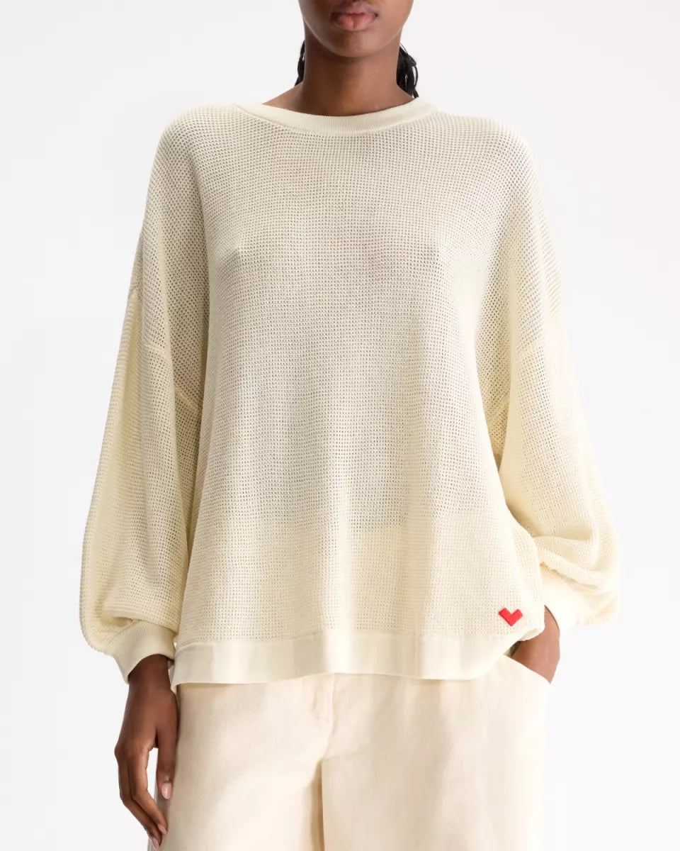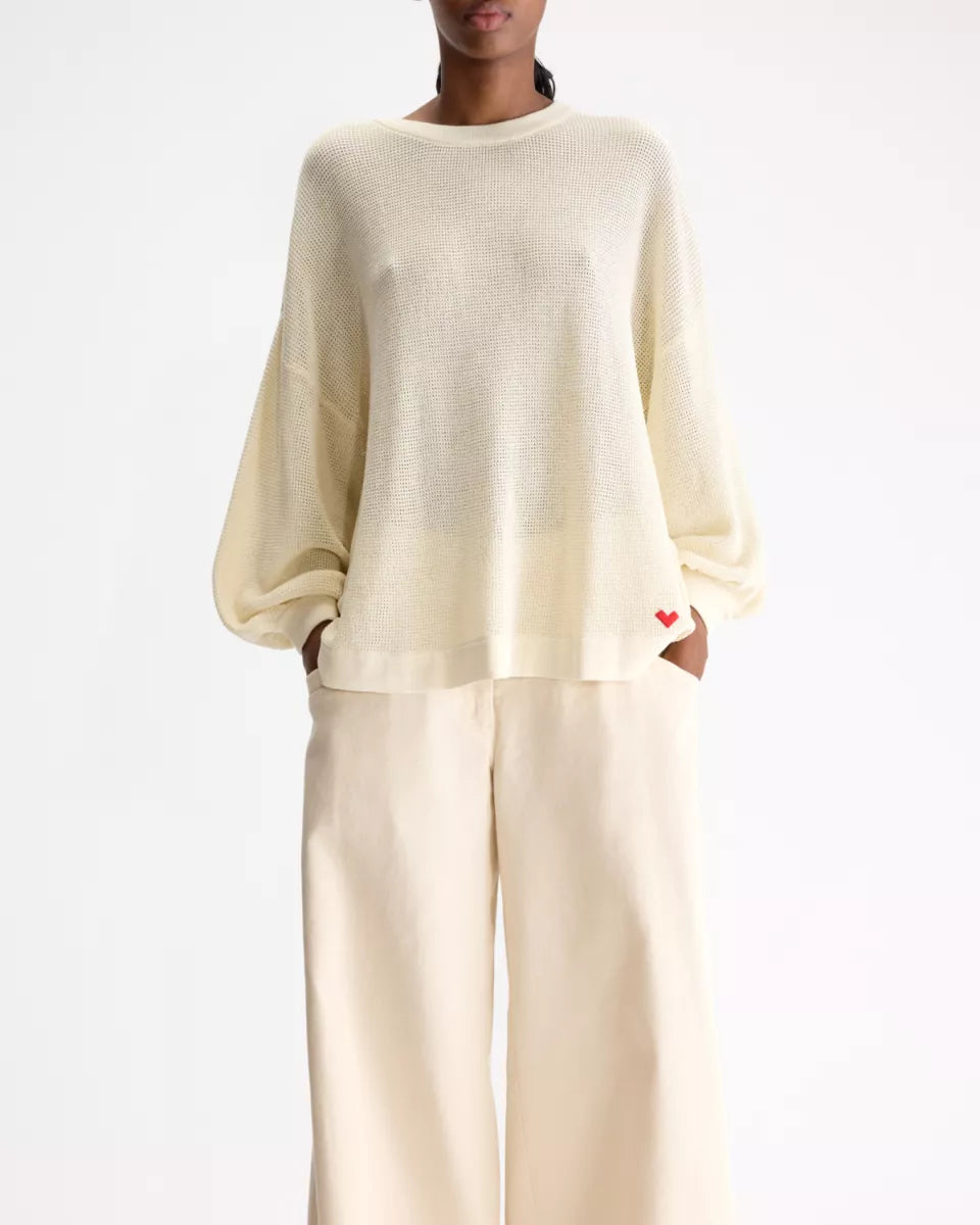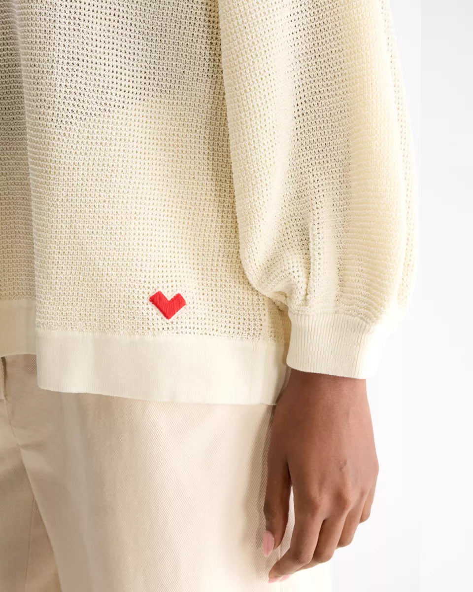 De Alie knit van Bellerose in ecru is een gebreide trui met een open, grove structuur. Het model heeft een ronde hals, lange mouwen met ruime mouwvorm en brede boorden bij hals, manchetten en zoom. Onderaan is een klein rood hartdetail zichtbaar. De afwerking oogt strak en de trui valt losjes rondom het lichaam. Soort artikel: knitwear.
