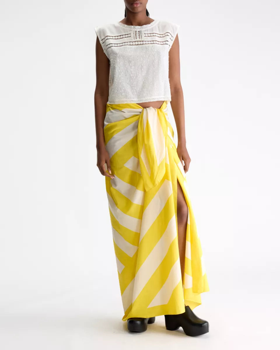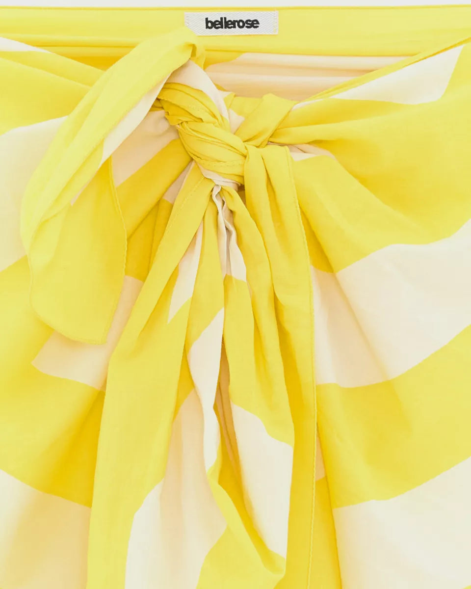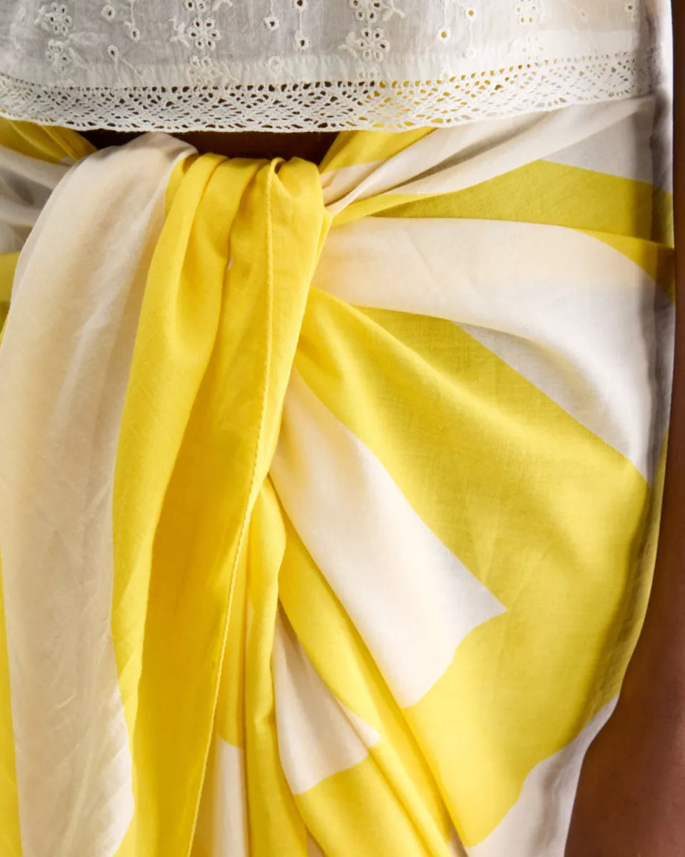 Sanapy is een Bellerose sjaal in geel met een grafisch dessin in een lichtere tint. De stof is 100% katoen en voelt licht en soepel aan. De sjaal heeft een ruime maat en een zachte valling, waardoor je hem breed kunt draperen of compact kunt knopen. De afwerking is strak en zonder opvallende hardware, met focus op de print en het formaat. Soort artikel: accessoires.
