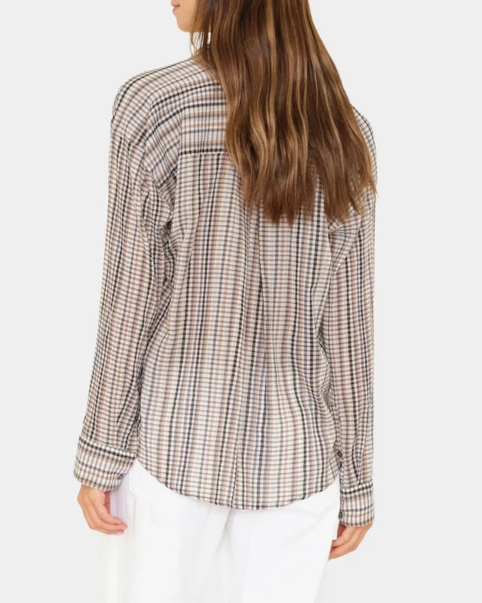 Deze geruite Xirena blouse in seersucker stof heeft een ecru basis met een fijn ruitdessin in donkere en warme tinten. De blouse is uitgevoerd in katoen en voelt licht en prettig aan op de huid. Voorzien van een kraag, een knoopsluiting aan de voorkant en lange mouwen met manchetten. De achterkant is afgewerkt met een schouderpas en een plooi voor extra bewegingsruimte.